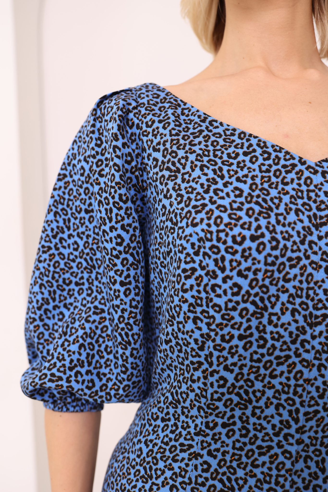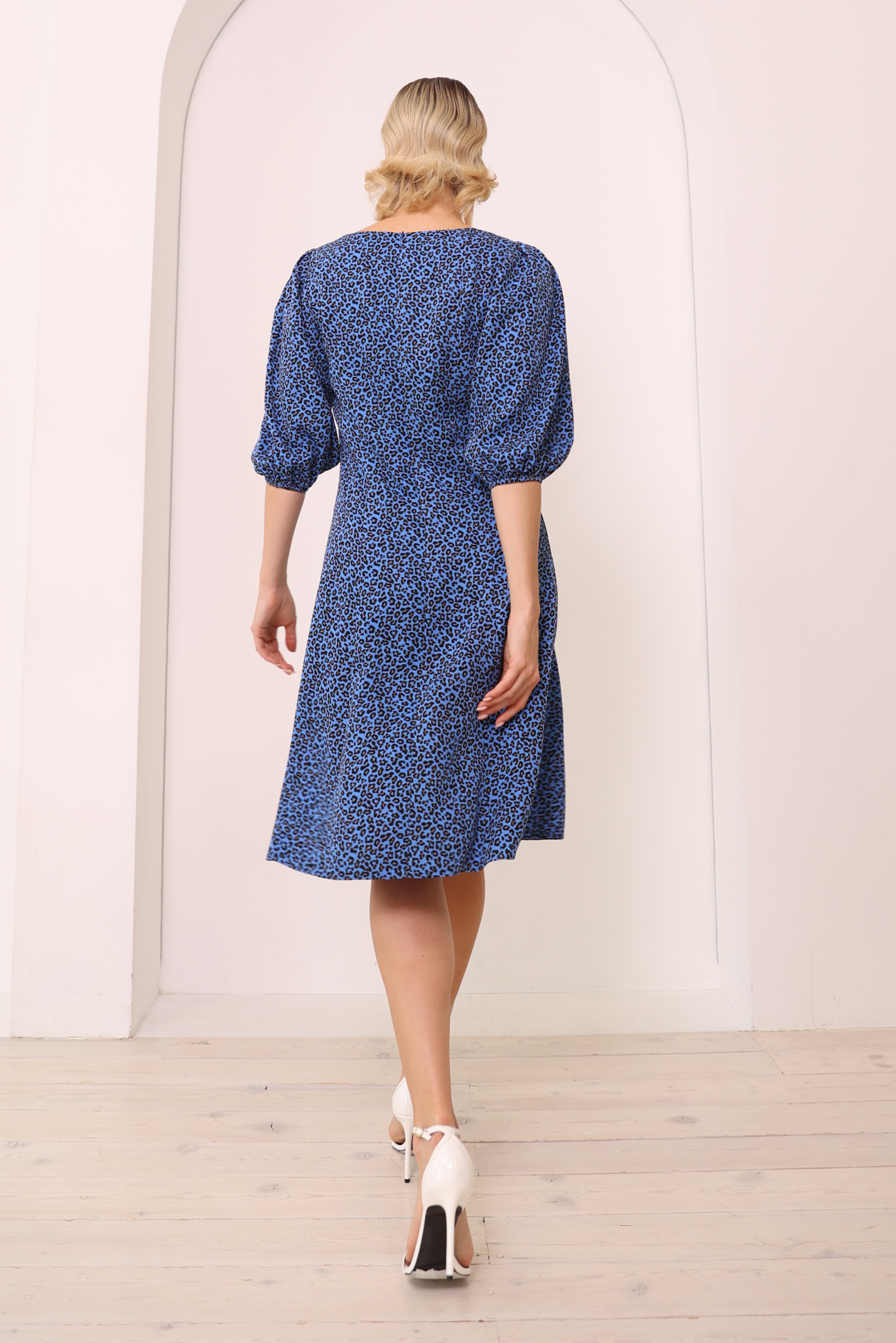 Приталенное платье с расклешённой юбкой. V-образный вырез декольте. Пышный, втачной рукав ¾ на резинке. Ткань: вискоза-твил