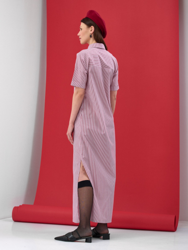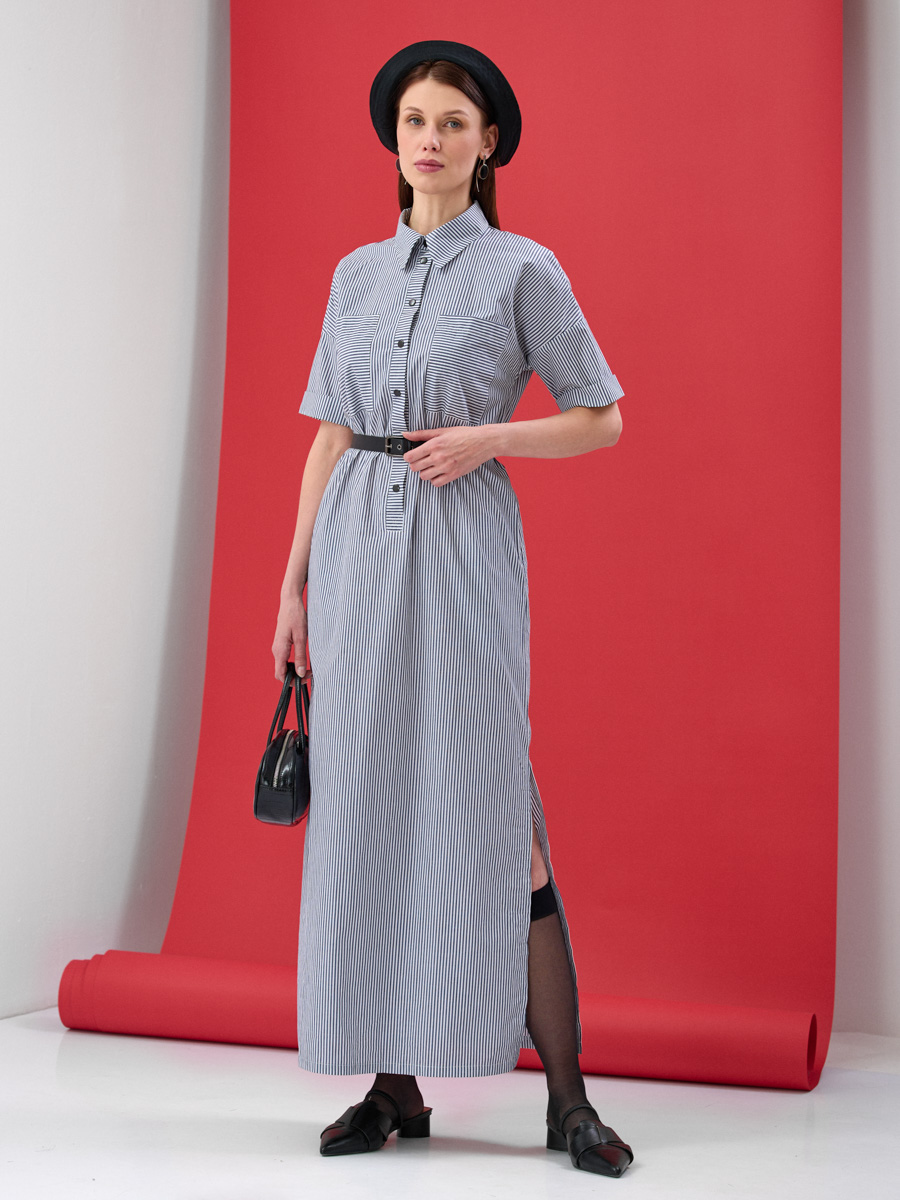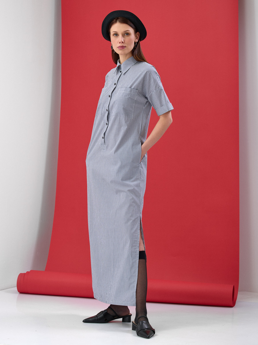 Длинное платье выполнено из хлопка, принт полоса. Спущенная линия плеча, рукав короткий с отворотом. Рубашечный воротник, застежка - планка на металлических кнопках. Большие накладные карманы по переду лифа. Спинка на кокетке. Высокие разрезы по боковым швам изделия.Рост модели 173 см. Машинная деликатная стирка.