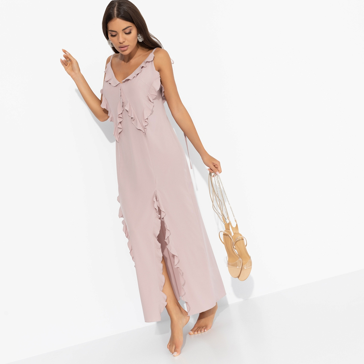Проснувшись утром я первым делом планирую вечер. Ведь сегодня самое интересное запланировано на время после заката. День, наполненный приятными хлопотами, завершается походом в недавно открывшийся ресторан в платье CHARUTTI. Хорошо быть мной – не жизнь, а сказка. Платье на тонких бретелях в длине макси с разрезами. Изделие урашено рюшами. Спинка открытая. Бретели оформлены тонкими регулируемыми завязками.
