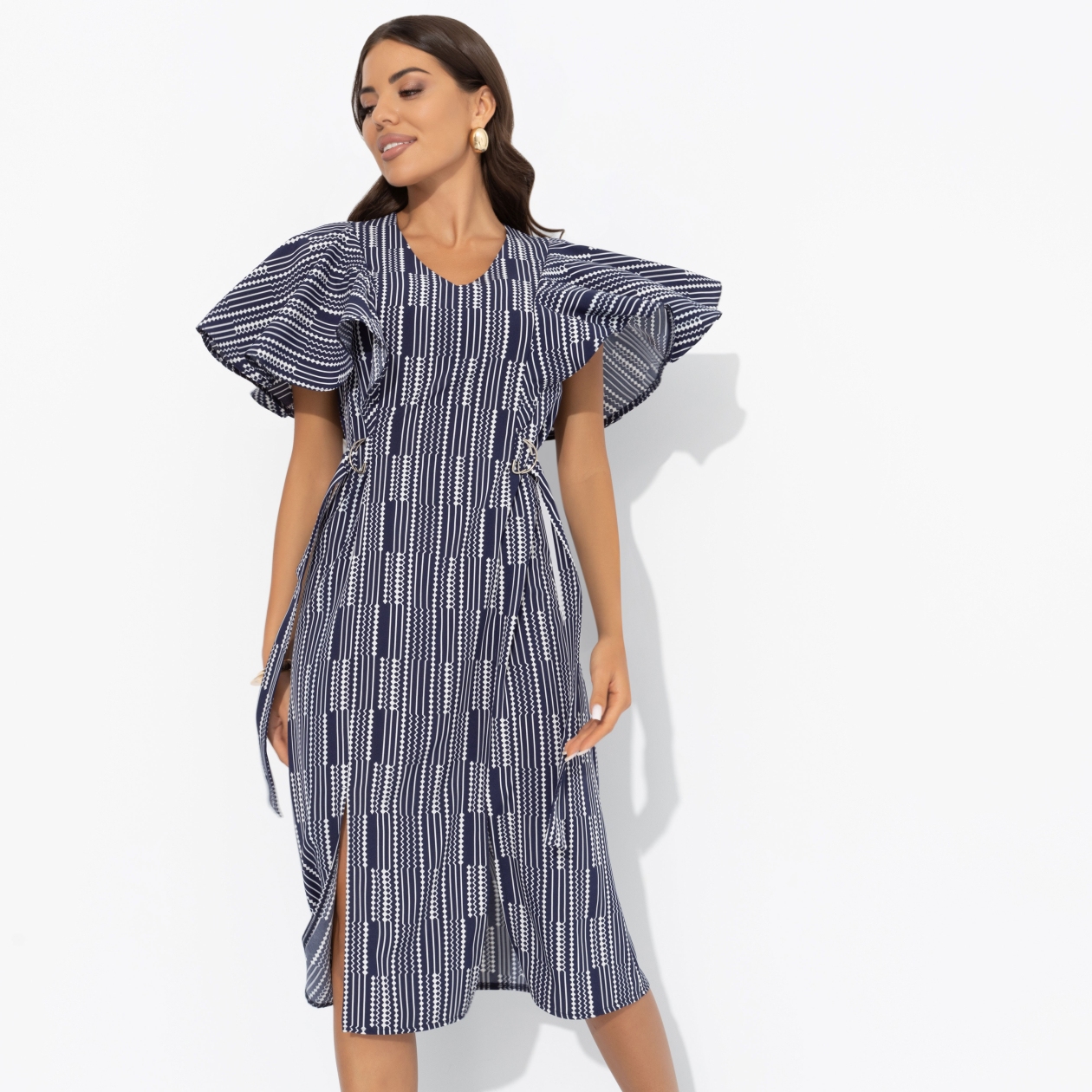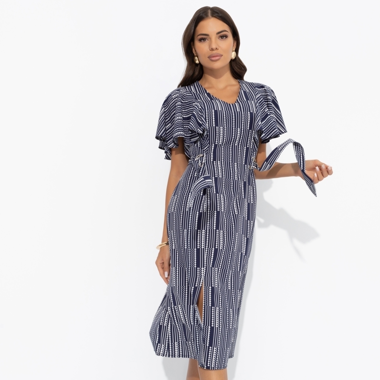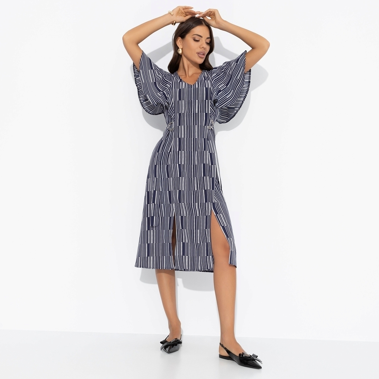 Ранним утром всё кругом говорило тебе: «Останься дома!». И только платье от CHARUTTI шепнуло: «Надень меня. Нас ждут великие дела». И действительно, всё в этот день складывалось наилучшим образом. Платье в длине миди приталенного силуэта. Линия талии регулируется вшитым поясом с металлической фурнитурой. Рукава изделия в виде объемных рюш. Есть разрезы спереди.