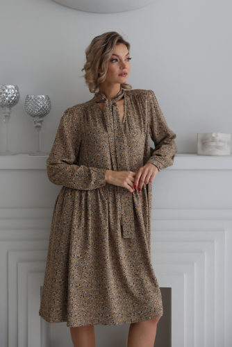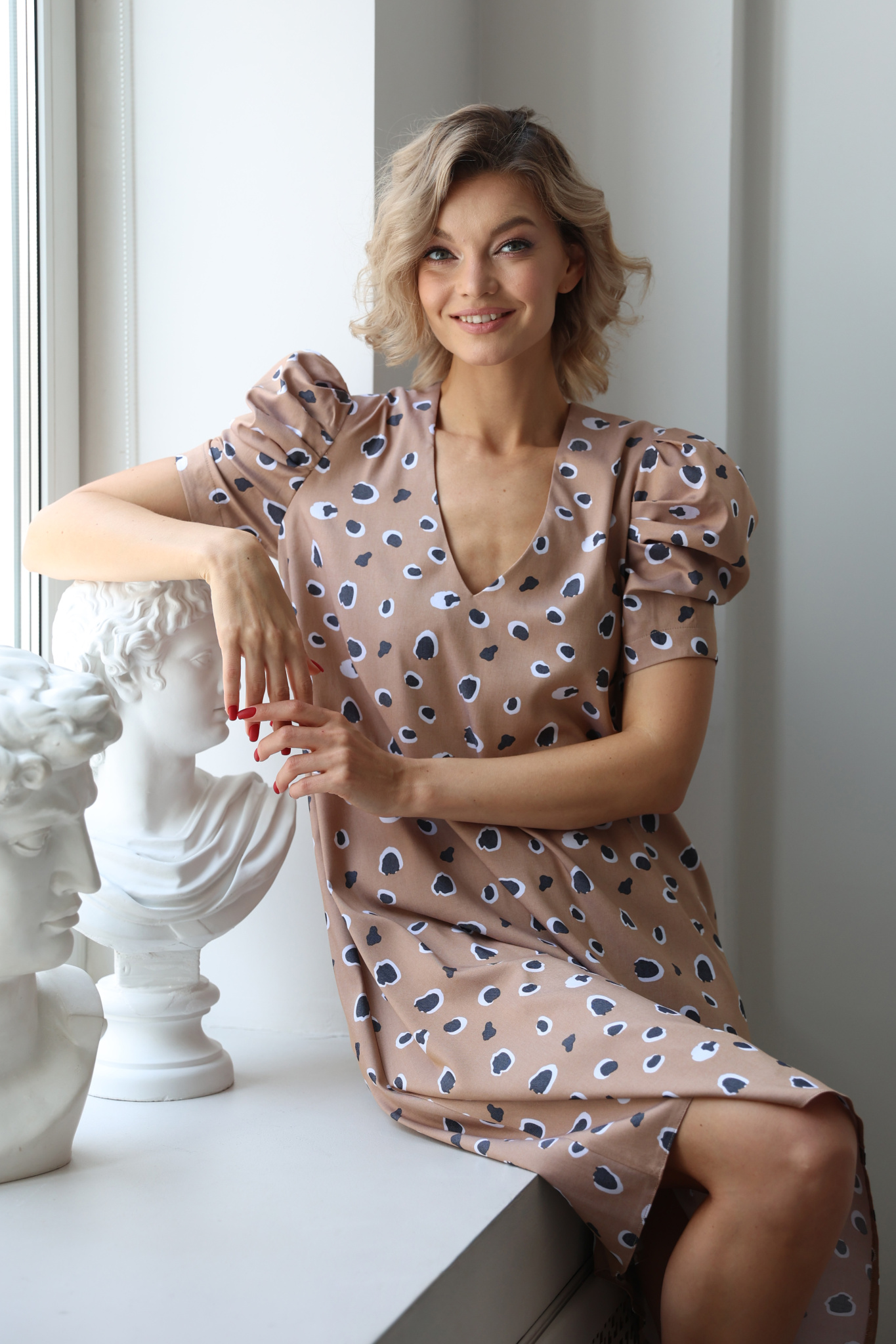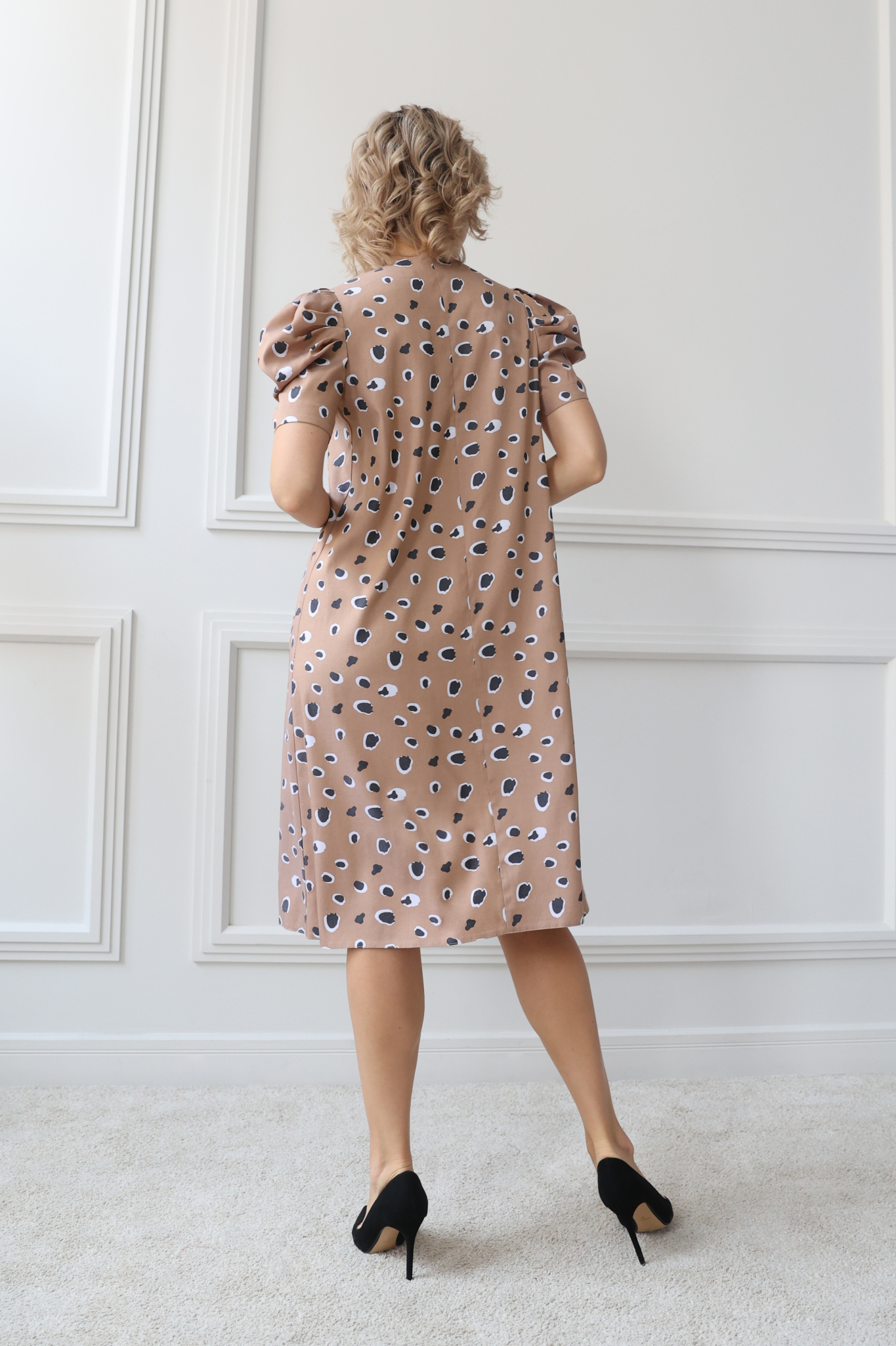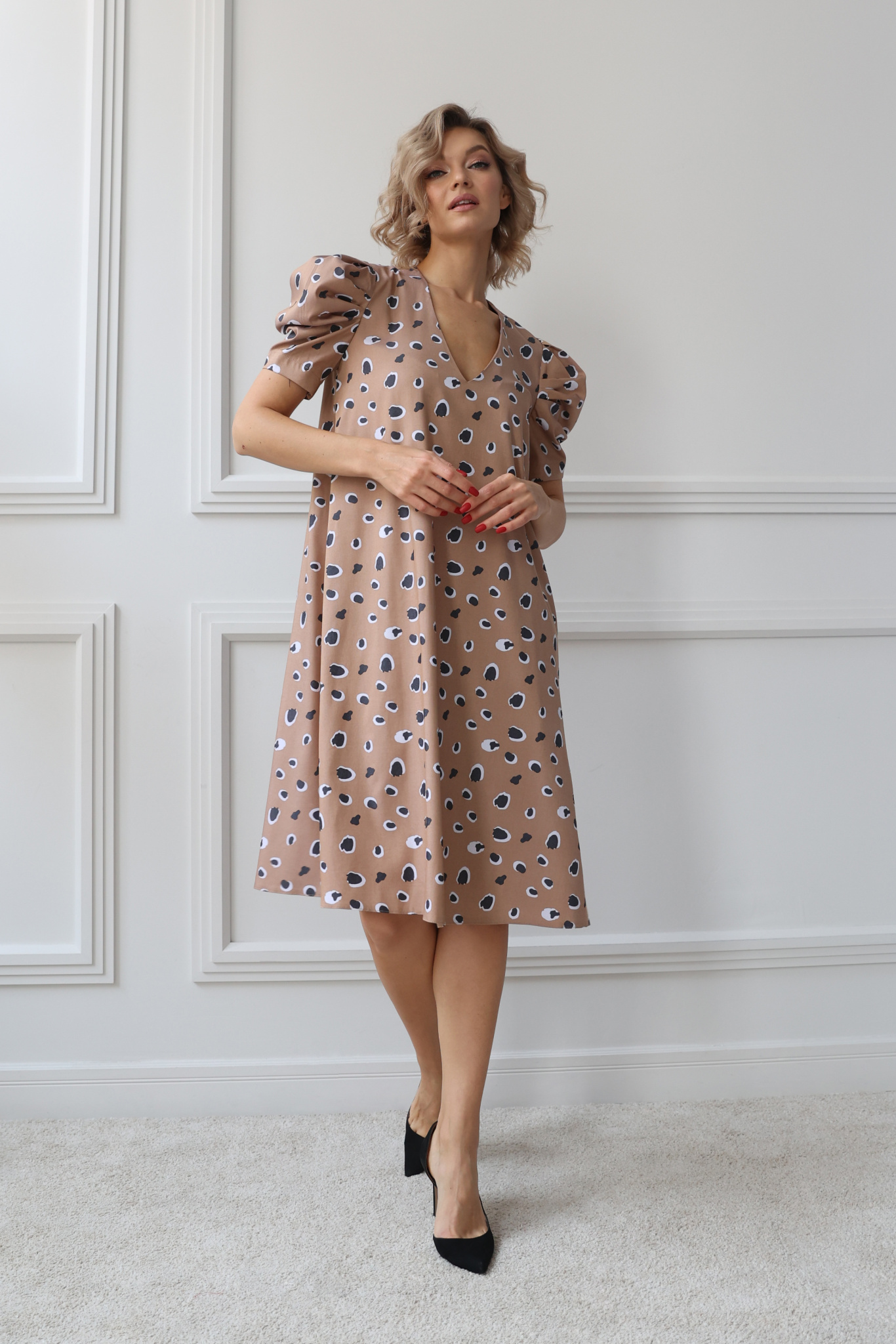 Платье миди А-силуэта. Втачные рукава-буфы, V-вырез горловины, средний шов спинки.