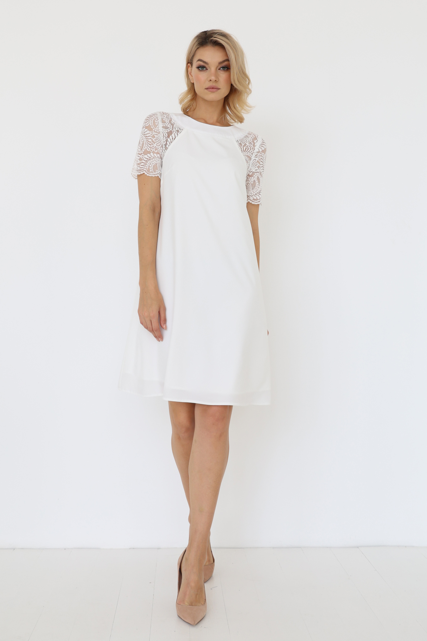 Платье А-силуэта с круглой горловиной и застежкой на пуговицы и рукавами из кружева.