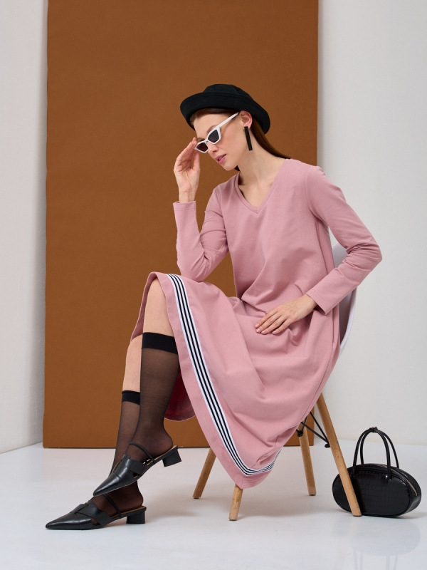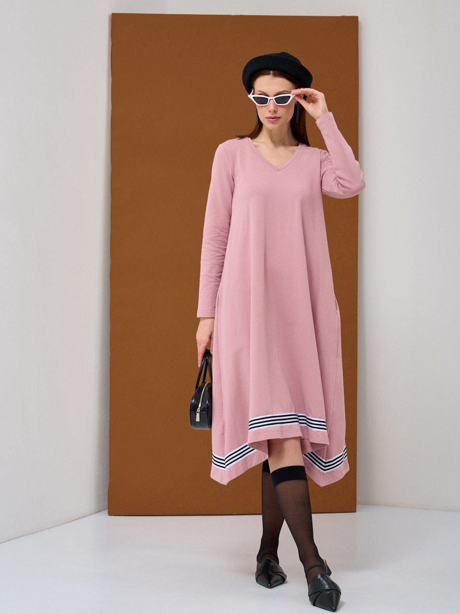 Платье из трикотажного полотна трапециевидного силуэта, с V-образным вырезом, длинным втачным рукавом и карманами в боковых швах. Оформлено декоративной тесьмой по низу изделия и центральному шву спинки. Шарф по запросу. Рост модели 175 см. Только ручная стирка.