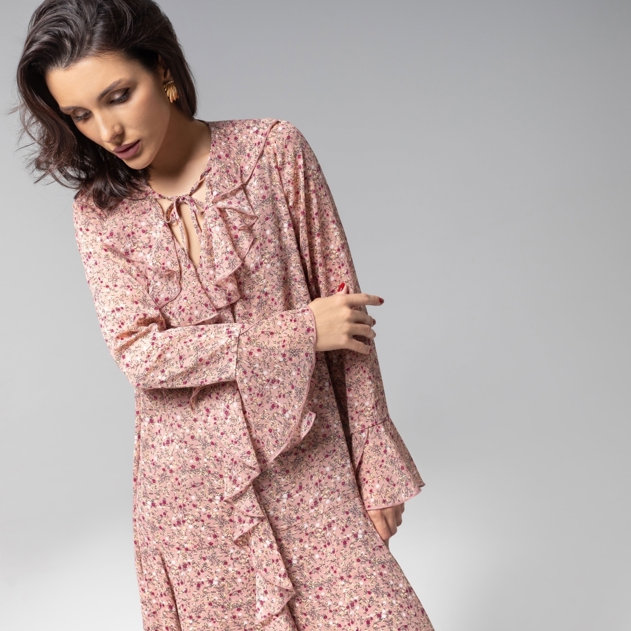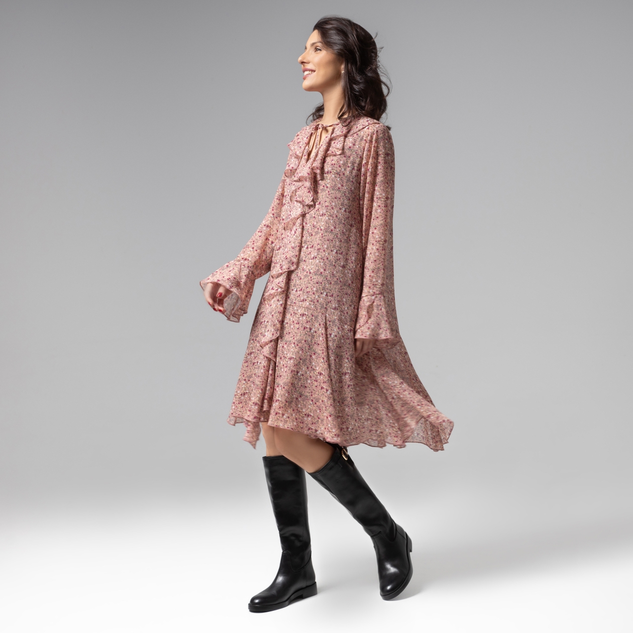 Цветочное вдохновение. Свободный силуэт из нежнейшей ткани воплощает современную интерпретацию бохо-эстетики с налётом итальянского шика. Эксклюзивная ткань создаёт благородную фактуру и сохраняет безупречную форму даже после многочасовой носки. Роскошный крой с продуманной драпировкой мягко моделирует силуэт, демонстрируя виртуозность конструкторского решения и внимание к женской фигуре. Каждый шов преврает воздушную простоту в предмет высокого модного искусства. Платье в длине до колена. Дополнено воланами и завязками в зоне декольте. Изделие с подкладом.