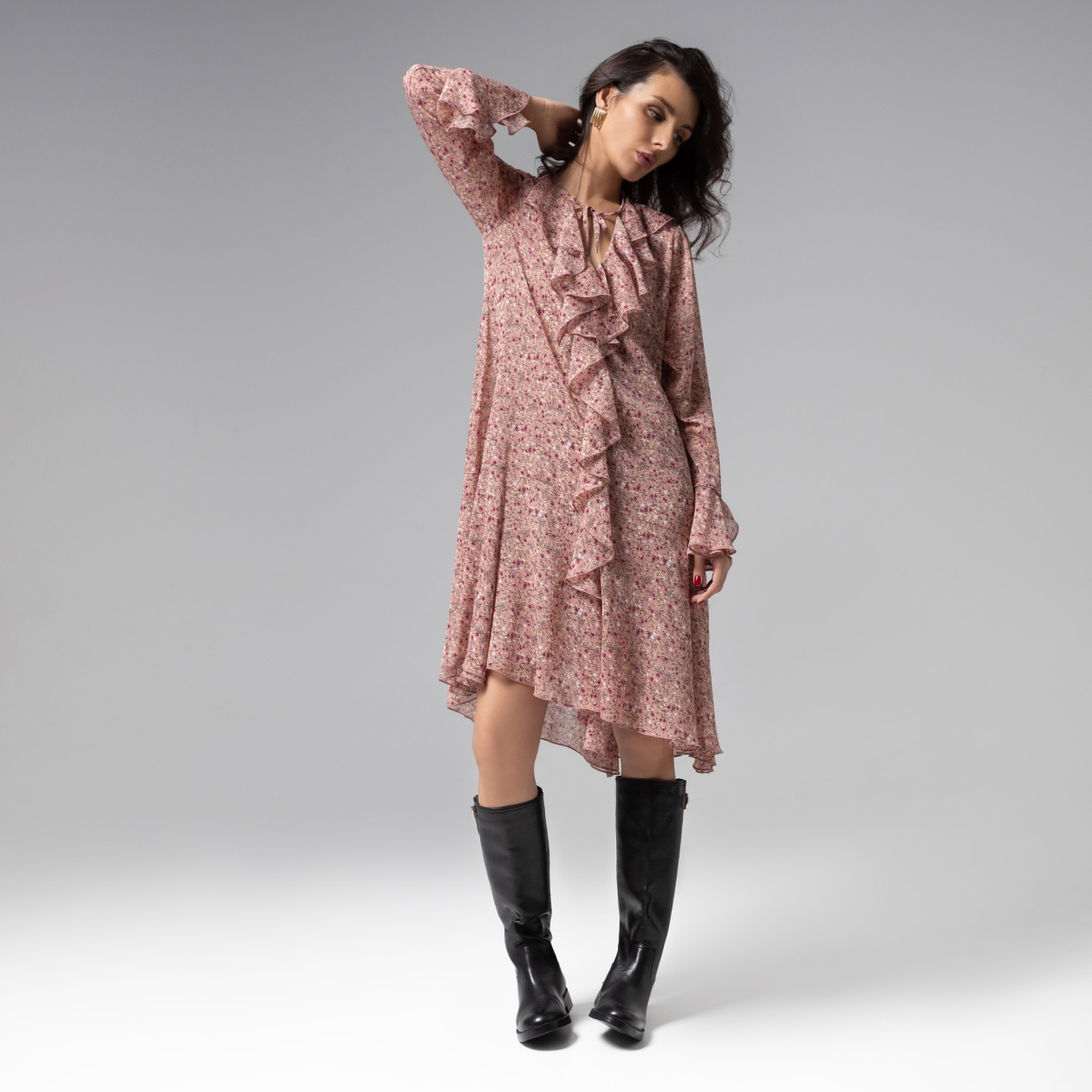 Цветочное вдохновение. Свободный силуэт из нежнейшей ткани воплощает современную интерпретацию бохо-эстетики с налётом итальянского шика. Эксклюзивная ткань создаёт благородную фактуру и сохраняет безупречную форму даже после многочасовой носки. Роскошный крой с продуманной драпировкой мягко моделирует силуэт, демонстрируя виртуозность конструкторского решения и внимание к женской фигуре. Каждый шов преврает воздушную простоту в предмет высокого модного искусства. Платье в длине до колена. Дополнено воланами и завязками в зоне декольте. Изделие с подкладом. Ошибка при загрузке данных! (https://charutti.ru/upload/video-site/00000012009_video_site.mp4)