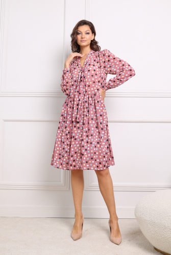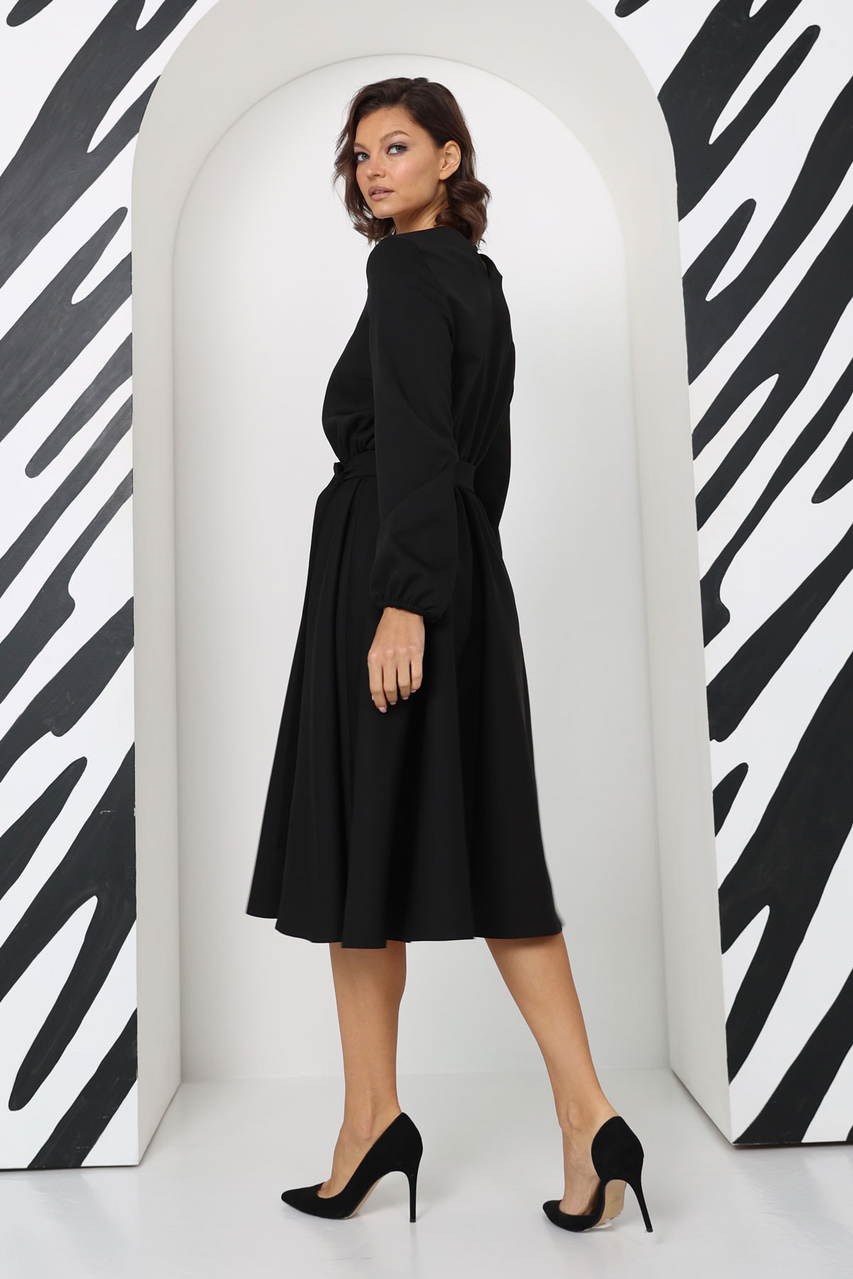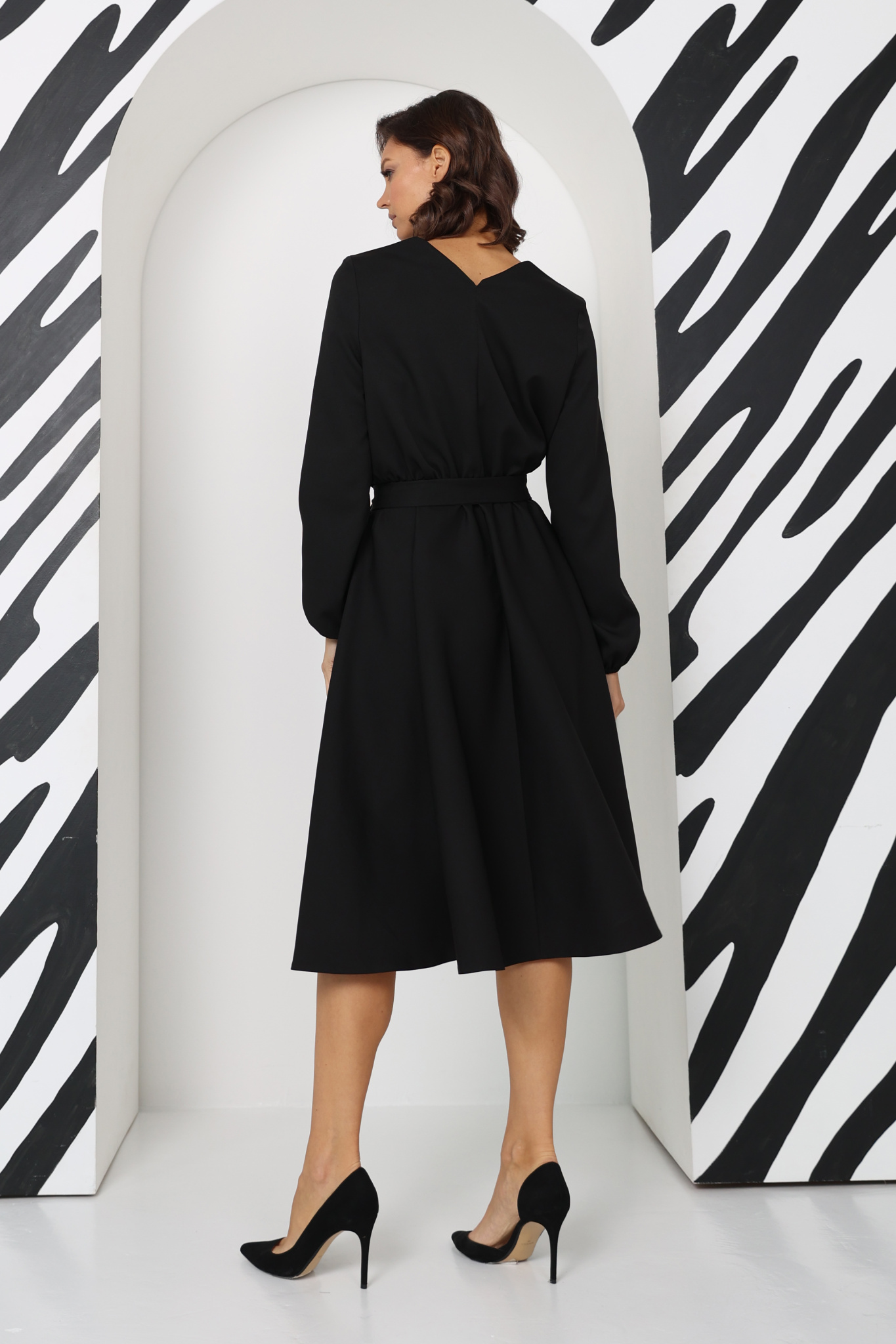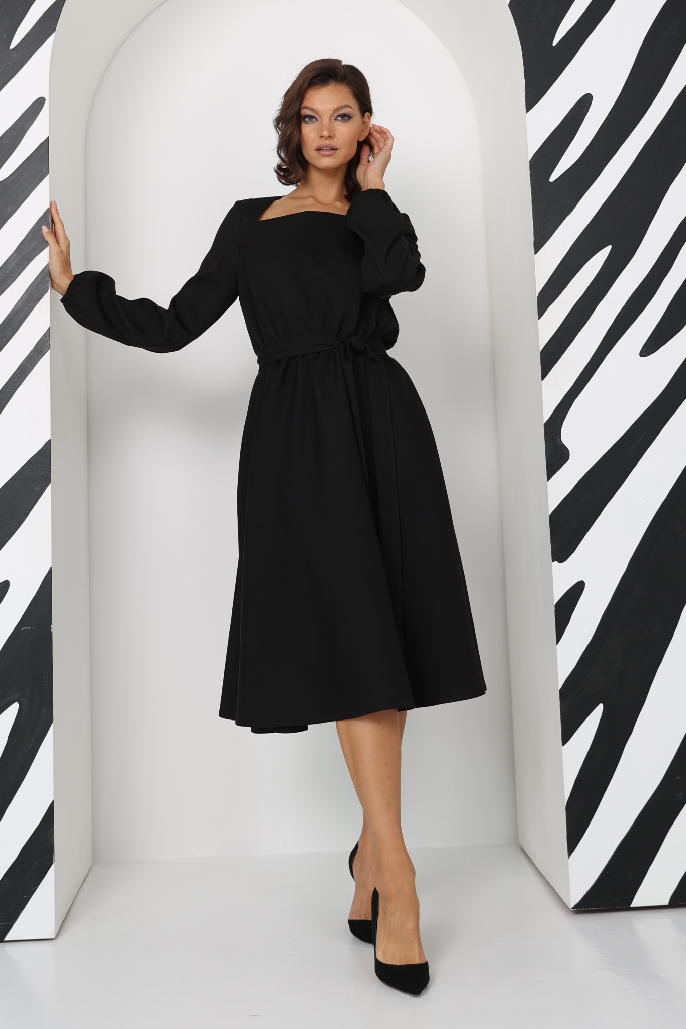 Платье с юбкой полусолнце и поясом в комплекте. Резинка по линии талии. Вырез-трапеция. Длинный рукав с резинкой по манжету.