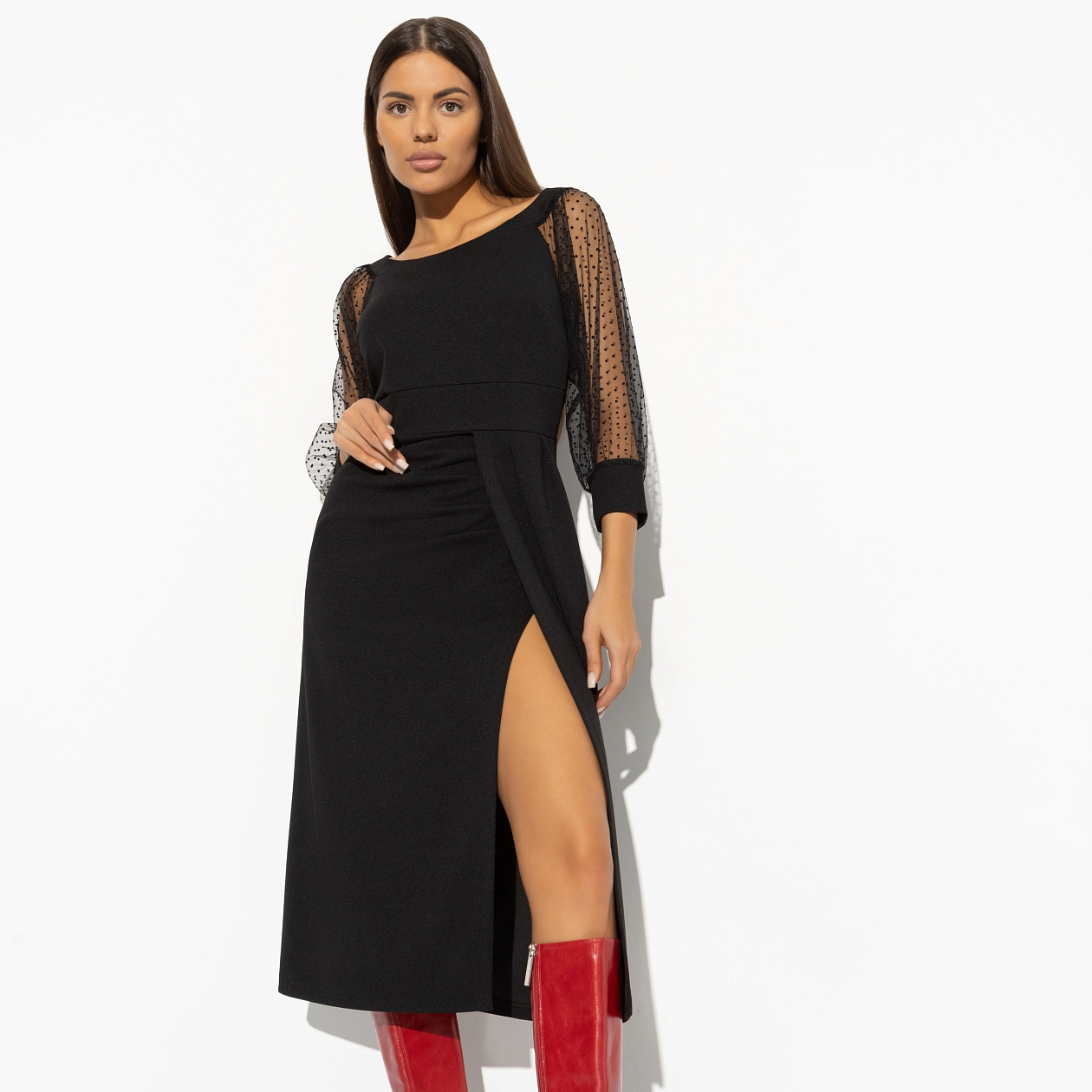 Платье «Смотрите на меня» – это не просто вечернее платье женское, это настоящее произведение искусства, способное подчеркнуть вашу индивидуальность и создать неповторимый образ. Впечатляющий крой с высоким разрезом на запах придает платью особый шарм, делая его идеальным выбором для особых случаев. Приталенный силуэт и длина миди добавляют элегантности, а тонкое прозрачное кружево на рукавах привносит нотку романтичности. Это платье вечернее женское создано для тех, кто знает себе цену и готов восхищать окружающих. Оптом приобретая такие платья, вы обретаете не только стиль, но и уверенность в себе.