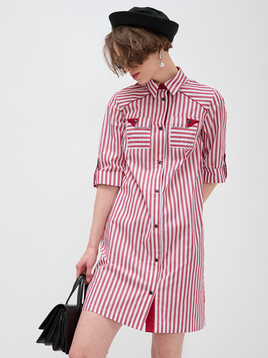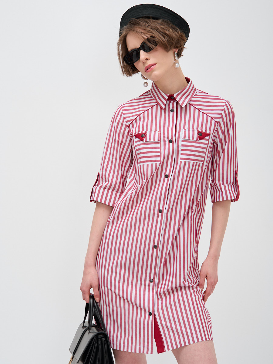 Платье-рубашка прямого силуэта из хлопка с фигурной кокеткой по переду и классической кокеткой по спинке. Платье имеет накладные карманы с клапанами на груди и прорезные карманы по бокам. Рост модели 170 см. Машинная деликатная стирка.