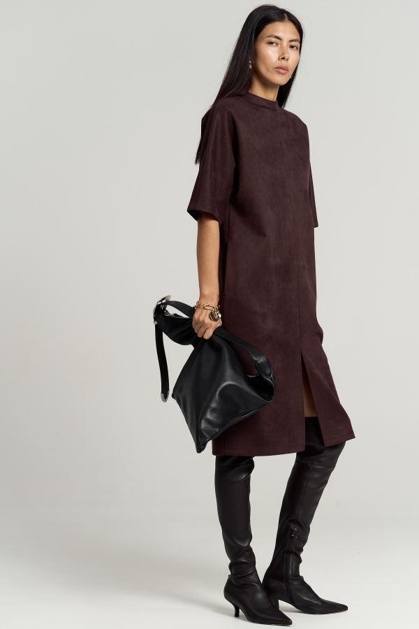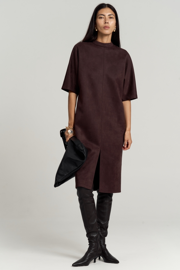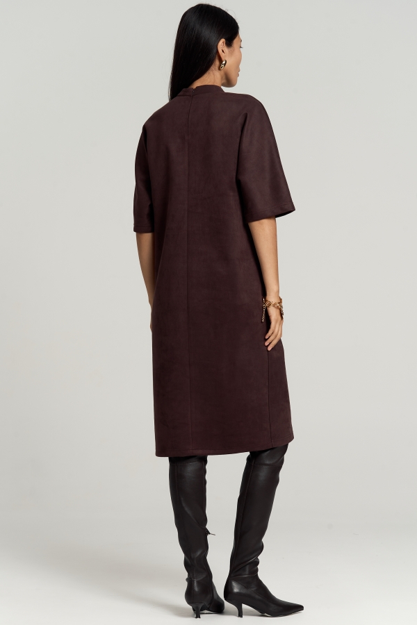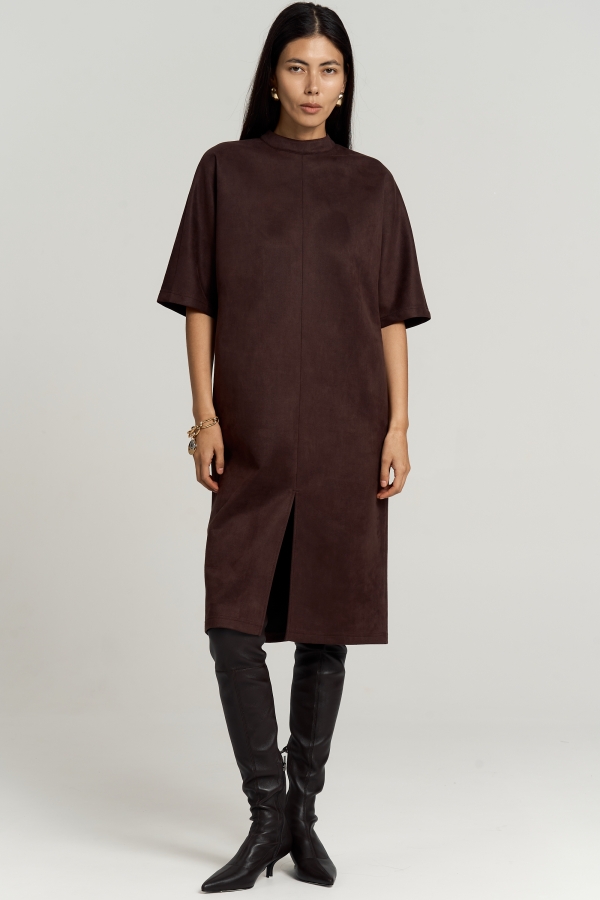 Модель прямого силуэта, с цельнокроеным коротким рукавом. Воротник стойка. По переду средний шов, высокий разрез. На спинке застежка молния. Карманы в боковых швах.