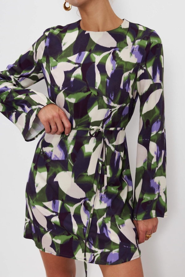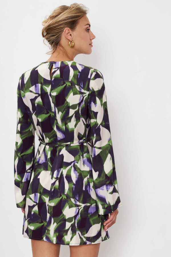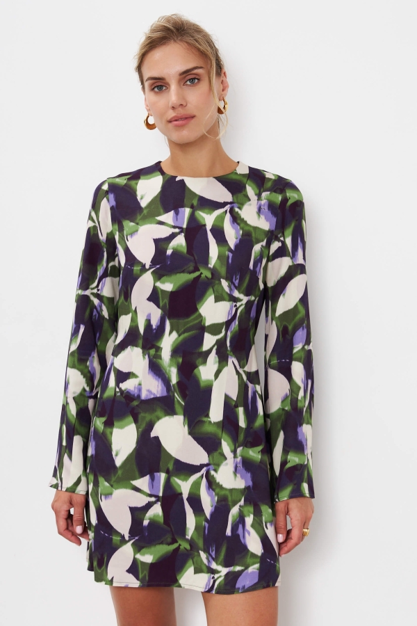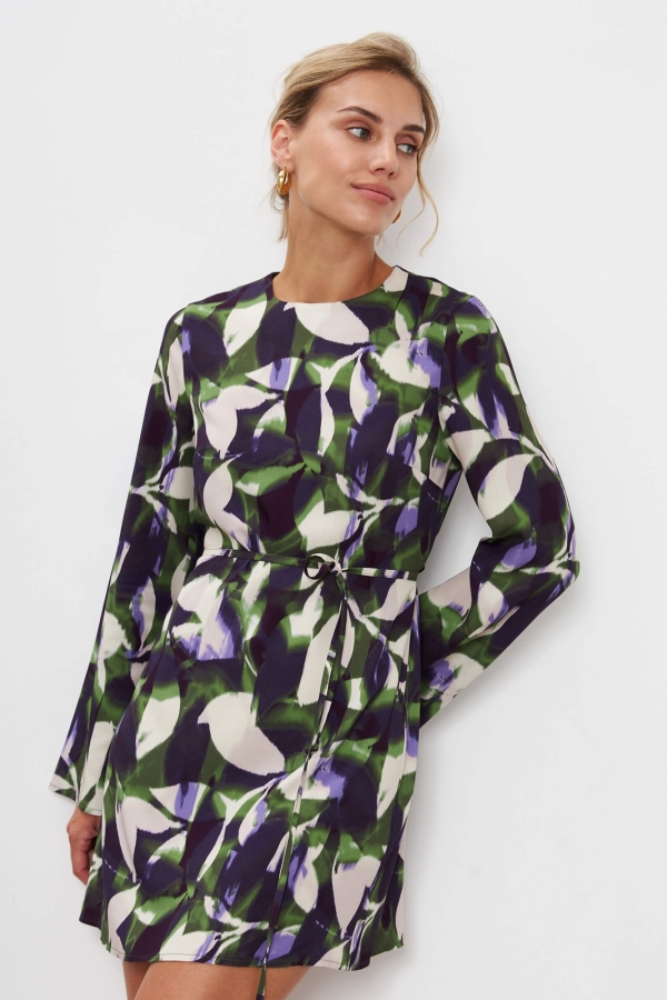 Женственное платье из высококачественного вискозного полотна с авторским принтом. Модель А-силуэта с расклешенным рукавом. Застёжка на спинке на петлю и пуговицу.