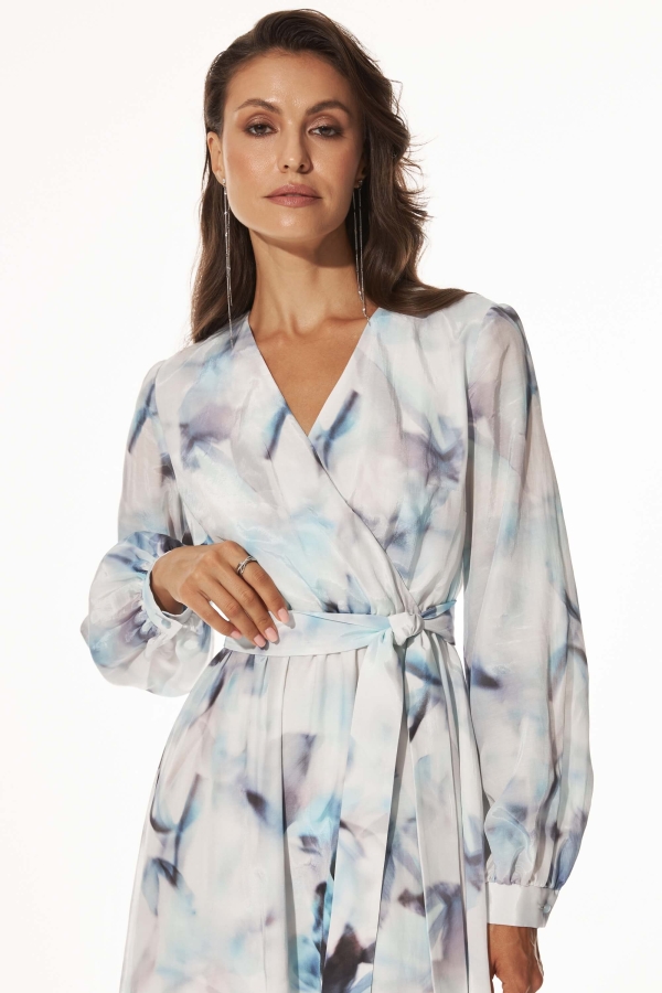 Платье длины миди из воздушной вискозы с переливом. Спереди декоративный запах, отрезное по талии и на резинке. Рукав длинный, втачной, на манжете. Пояс в комплекте.