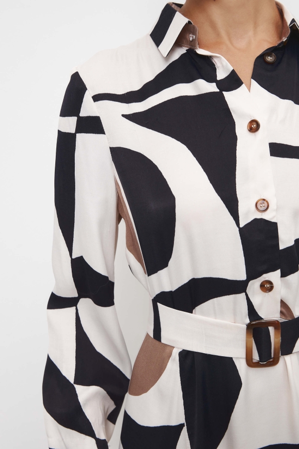 Платье из вискозного полотна с абстрактным принтом. Модель полуприлегающего силуэта. Рубашечный воротник. Рукав длинный, на манжете. Отрезное по линии талии, юбка с клиньями и асимметричным низом. По переду застежка на пуговицы. В комплекте пояс с пряжкой из основной ткани.