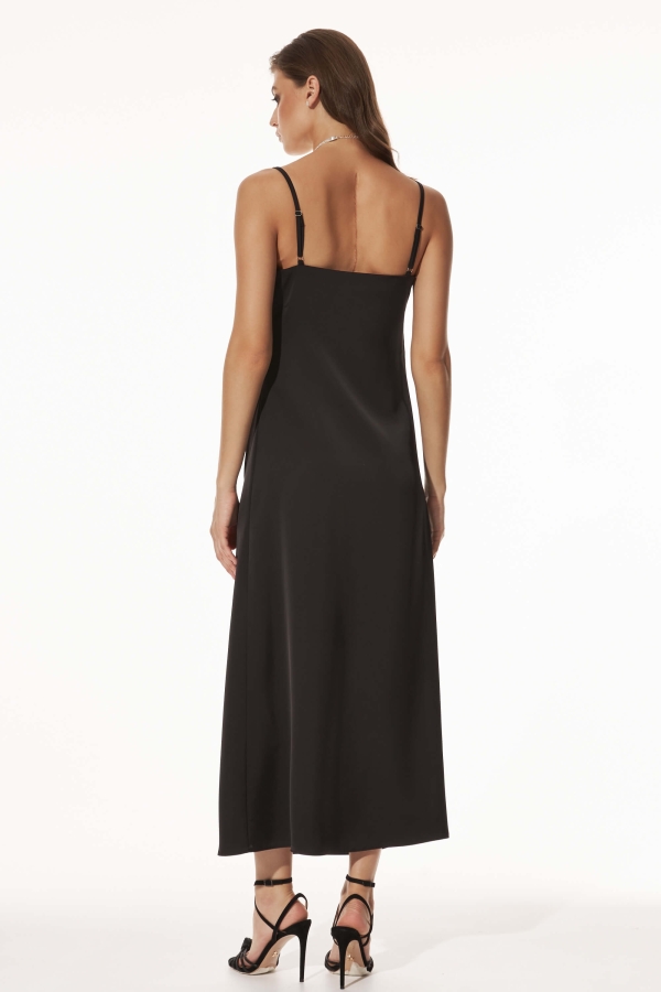 Платье-комбинация со сборками длины миди. Модель полуприлегающего силуэта на тонких регулируемых бретелях. По бокам декоративные складки. По переду деликатный разрез.