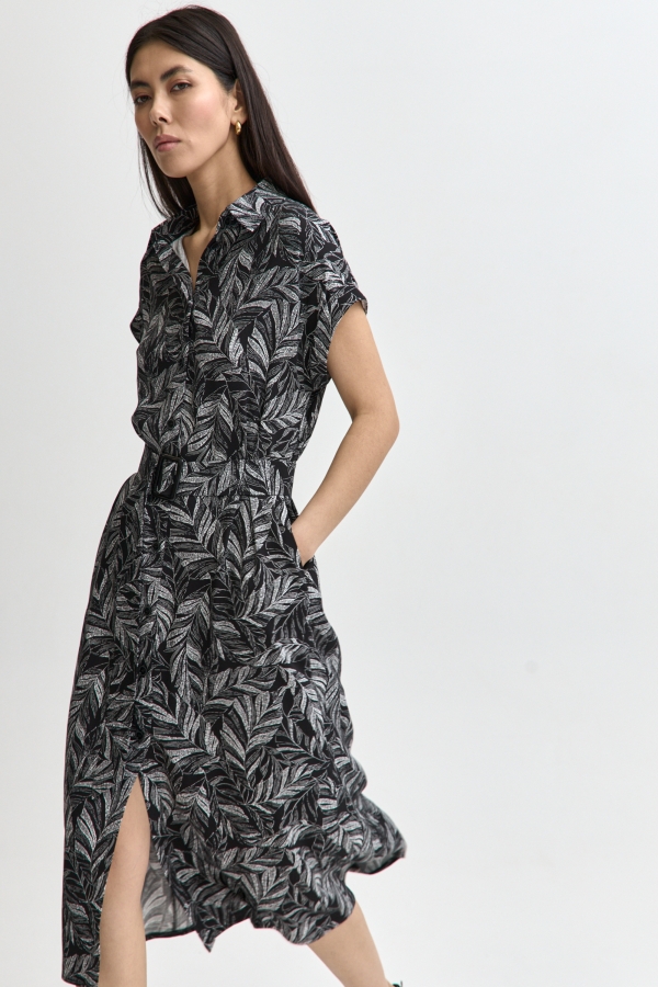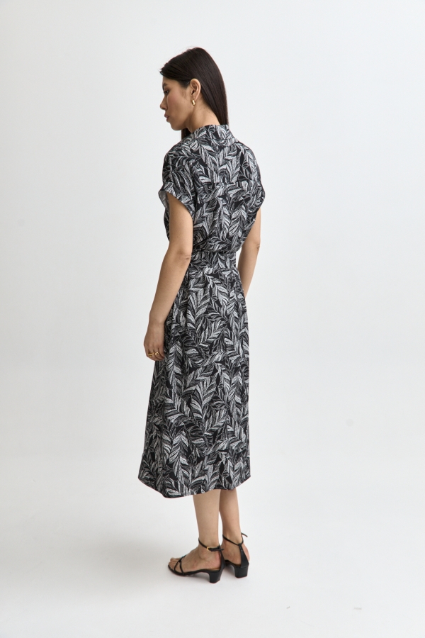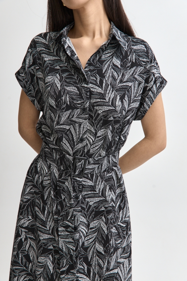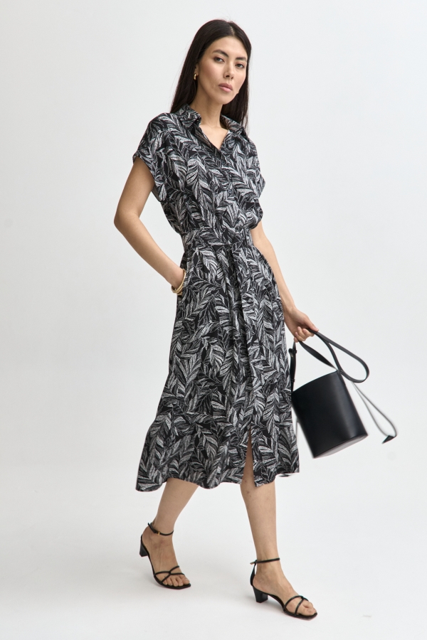Платье длины миди из вискозы-твилл. Модель А-силуэта. Рукав спущенный с манжетой. По переду застежка на петли и акцентные пуговицы. По спинке кокетка. Воротник отложной со стойкой. В комплекте пояс с пряжкой