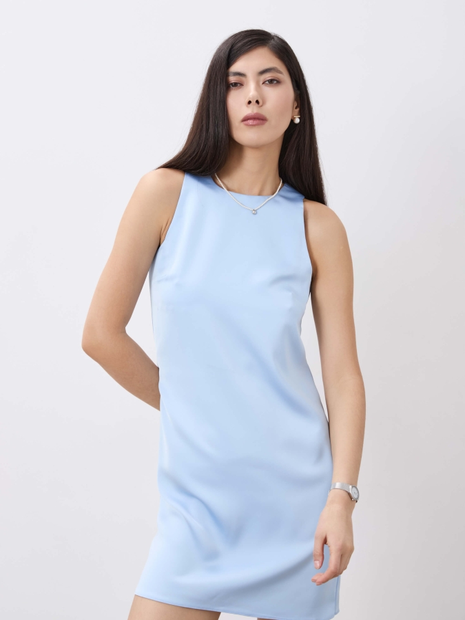 Лаконичное нежное платье из атласного полотна высокого качества в небесно голубом оттенке, в длине мини. Платье полуприлегающее прямое с круглой горловиной и застежкой на петлю и пуговицу на спинке.