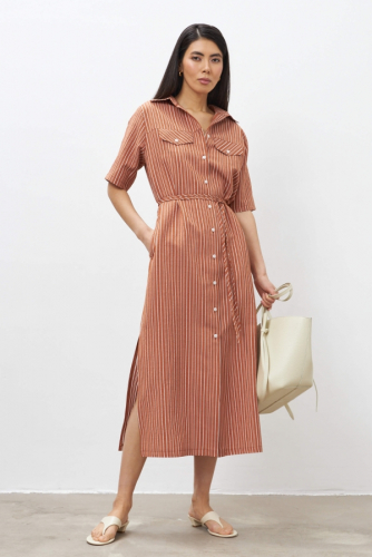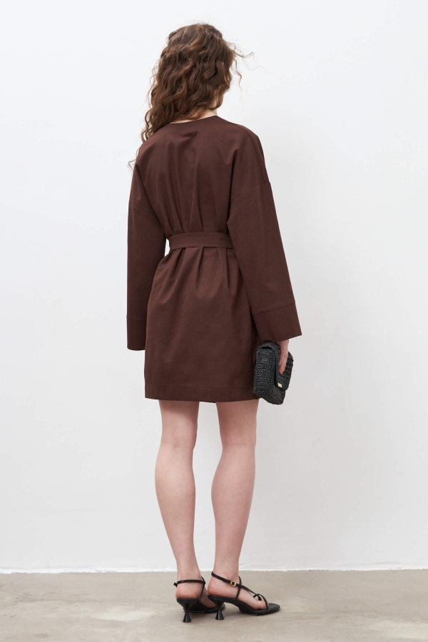 Лаконичное стильное платье из льняного полотна в благородном шоколадном цвете в длине мини. Свободное платье кимоно на запахе, рукав спущенный расклешенный к низу с отрезной манжетой. На талии шлевки и пояс из основной ткани.