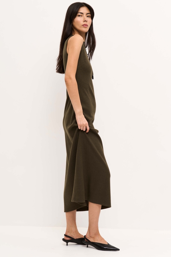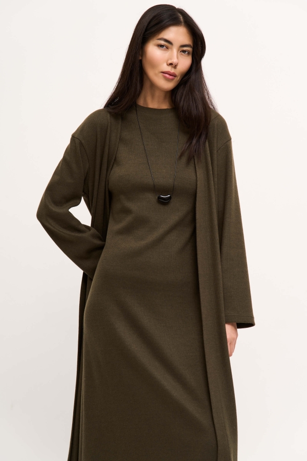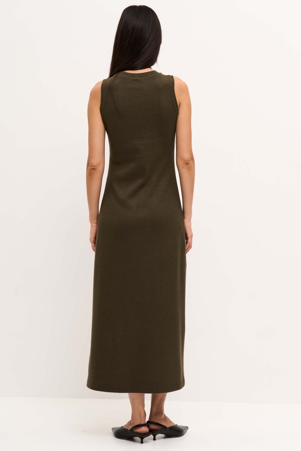 Платье из трикотажного полотна длины миди. Модель прилегающего силуэта, слегка расширенное к низу.