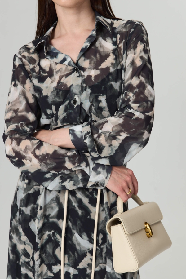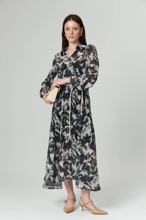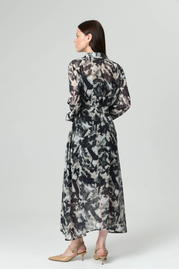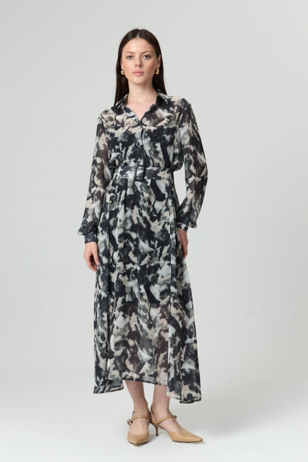 Платье из шифонового полотна с абстрактным принтом. Модель полуприлегающего силуэта. Рубашечный воротник. Рукав длинный, на манжете. Отрезное по линии талии, юбка с клиньями и асимметричным низом. По переду застежка на пуговицы. В комплекте пояс с пряжкой из основной ткани. В комплекте платье-комбинация из гладкого трикотажа.