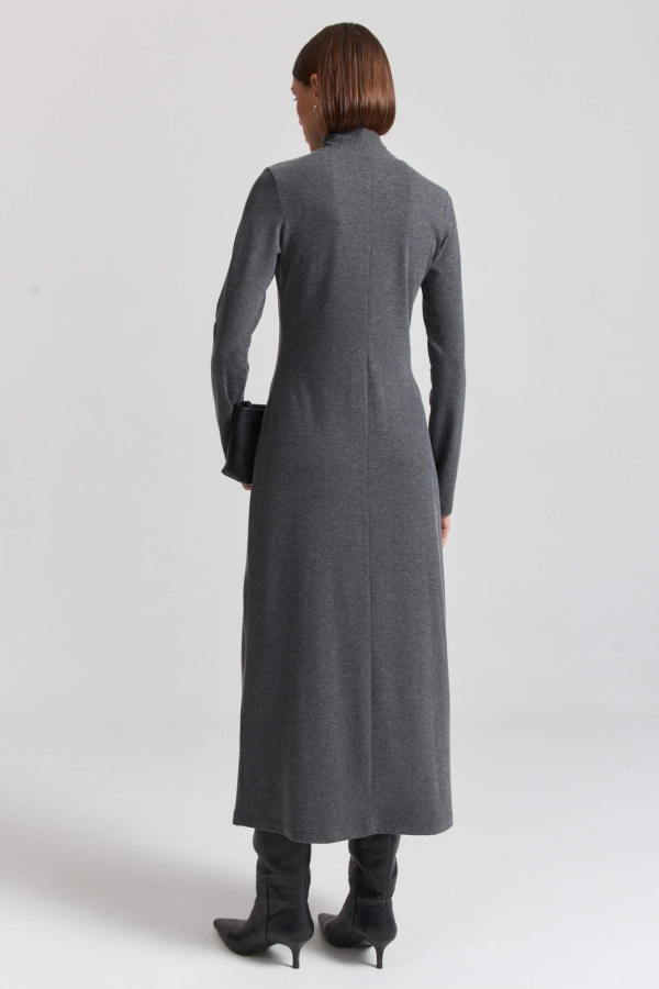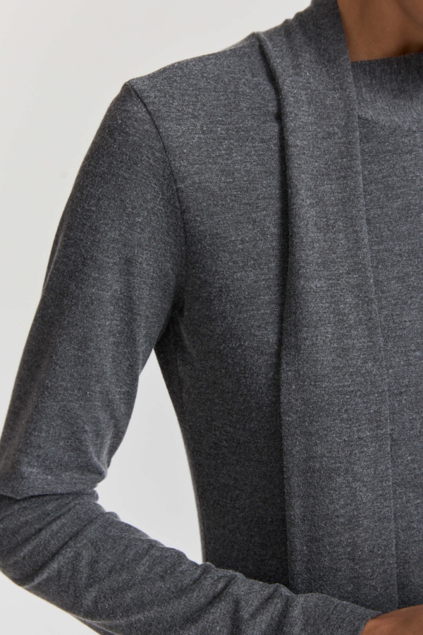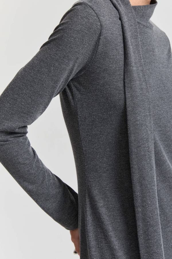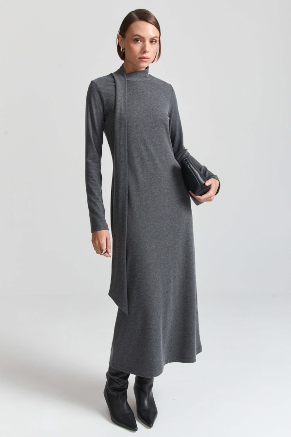 Элегантное платье из мягкого трикотажа. Модель полуприлегающего силуэта. Воротник-стойка переходящий в шарф. Юбка к низу расширяется. Рукав длинный.