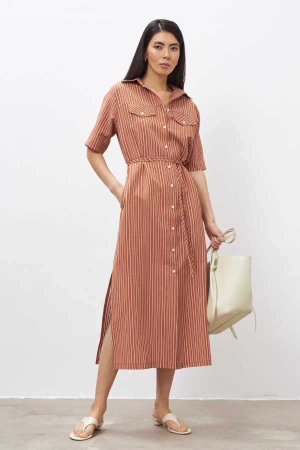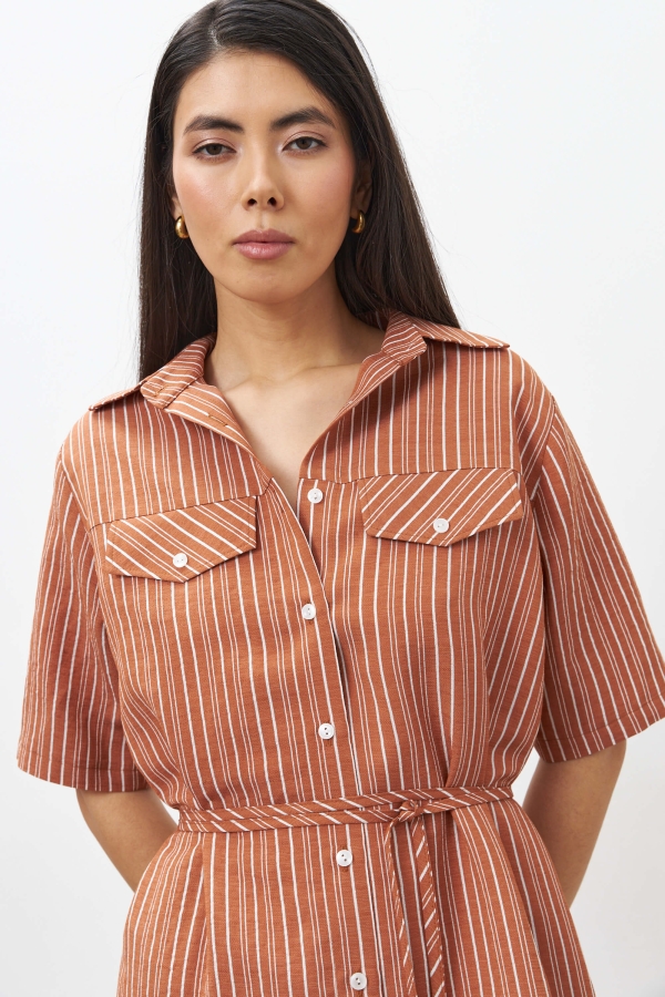 Стильное комфортное платье из вискозного полотна. Платье свободное, рукав втачной прямой. Воротник рубашечный на стойке. На спинке кокетка, карманы в боковых швах. Застежка на пуговицы и петли. В комплекте узкий пояс из основной ткани.