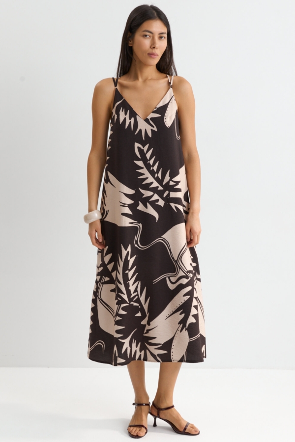 Сарафан из вискозного полотна с эксклюзивным принтом. Модель А-силуэта. По перду и спинке V-вырез. Двойные узкие бретели с регуляторами, пересекающиеся на спинке.