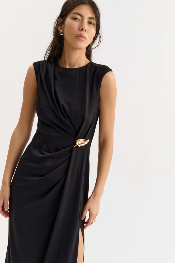 Элегантное платье для любого случая из трикотажного полотна. Модель прямого силуэта, отрезная по линии талии с деликатной линии плеча. По переду асимметричные драпирующиеся складки. Декоративная съемная брошь в комплекте. По спинке застежка на пуговицу.