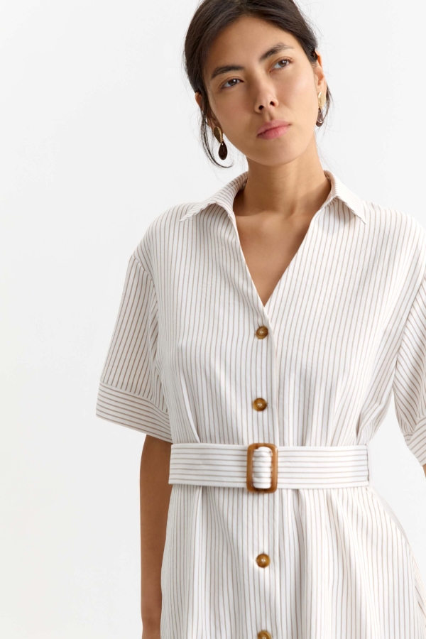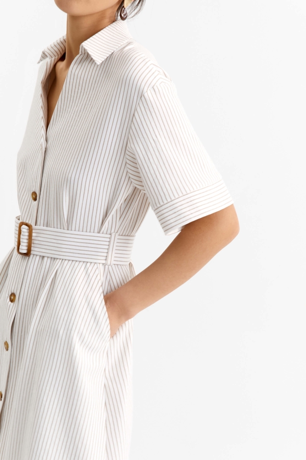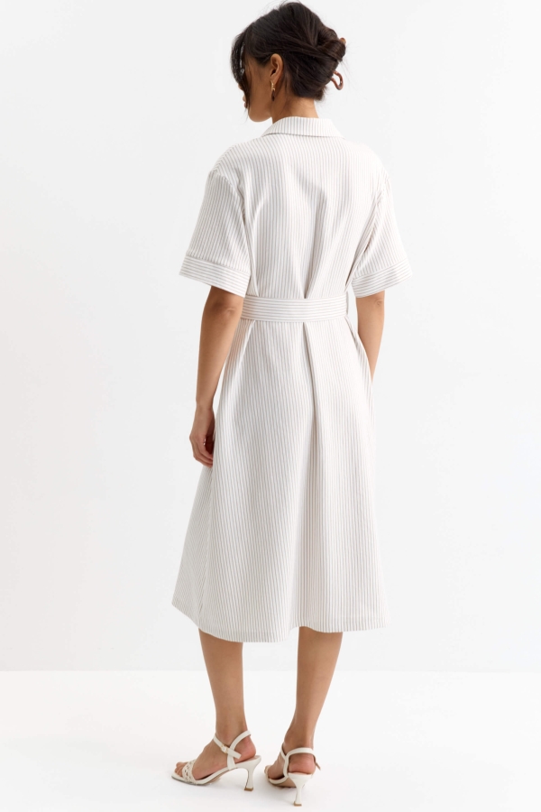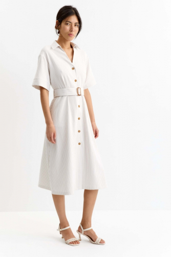 Элегантное платье длины миди в полоску. Модель отрезная по линии талии, умеренно расклешенная к низу. По переду застежка на петли и пуговицы и карманы. В комплекте пояс из основной ткани с пряжкой.