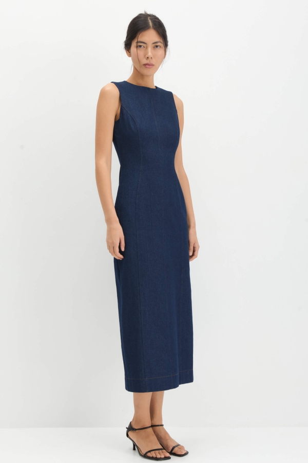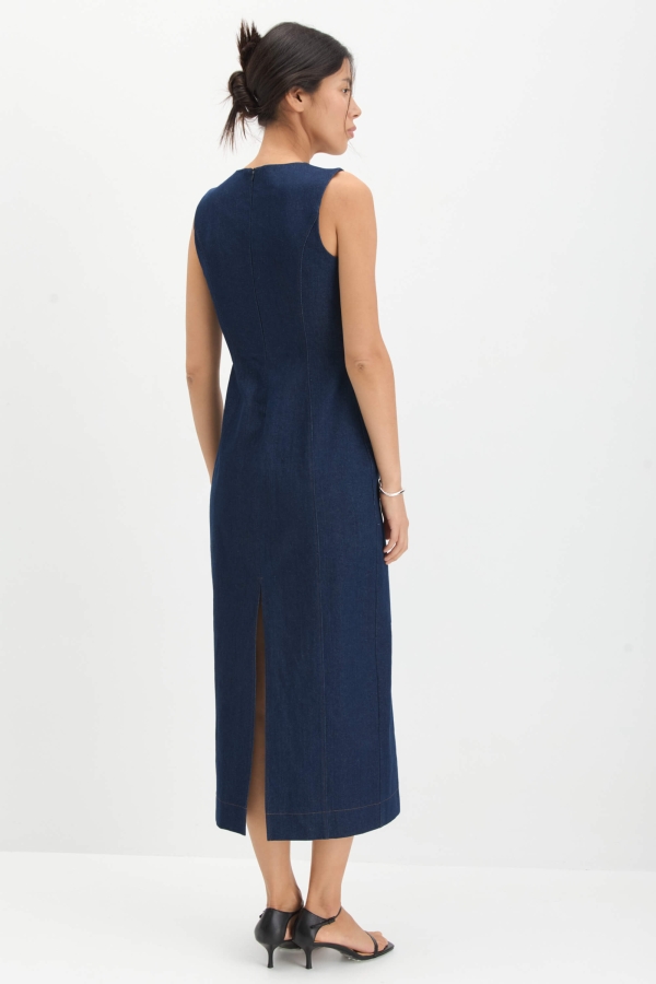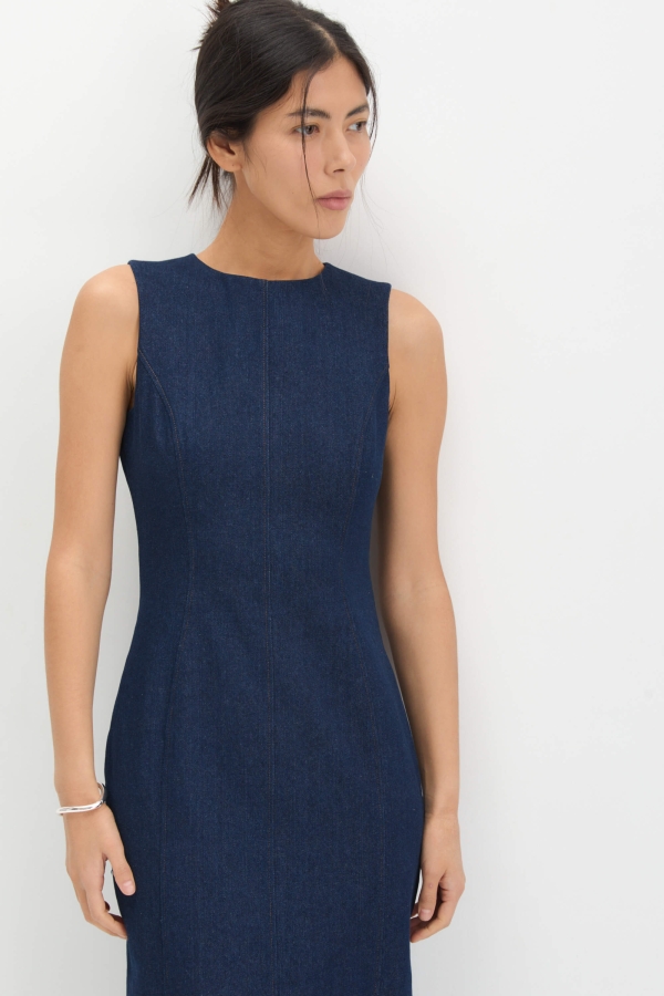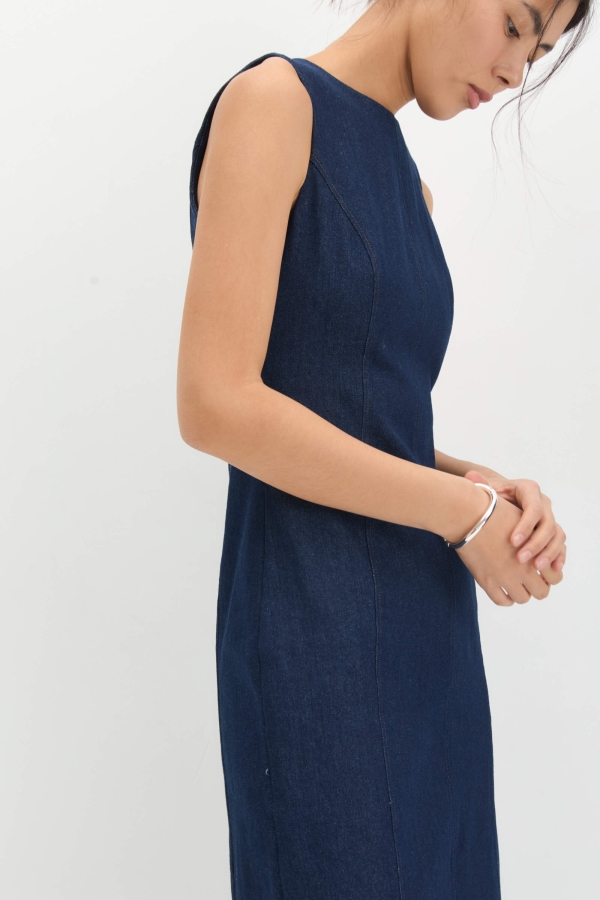 Платье-футляр длины миди из денима. Модель прилегающего силуэта с рельефами и декоративными, акцентными строчками. Низ изделия оформлен широкой подгибкой. По спинке разрез, застежка на потайную молнию.