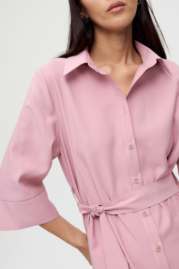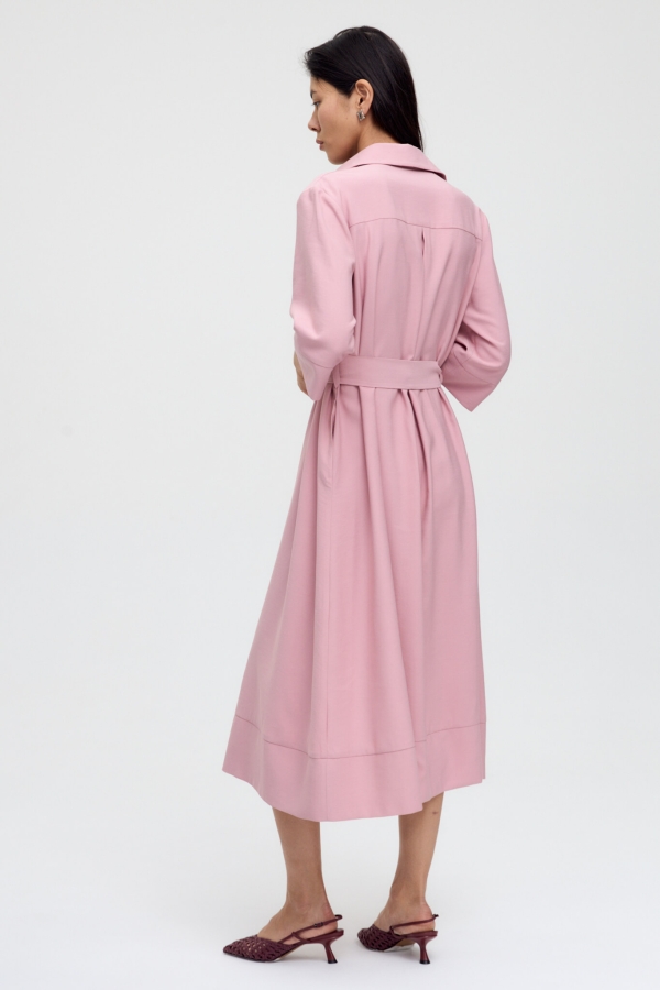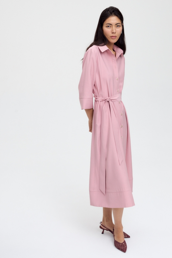 Платье длины миди из вискозного полотна. Модель А-силуэта с широкой подгибкой по низу и карманами в боковом шве. По переду планка с застежкой на пуговицы. Воротник рубашечный. По спинке кокетка.