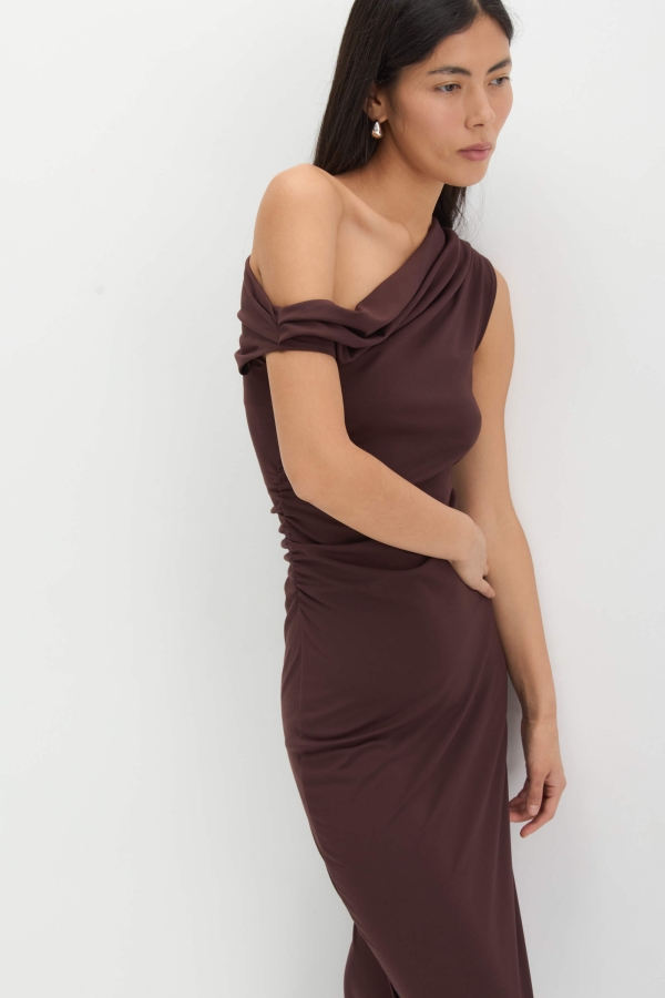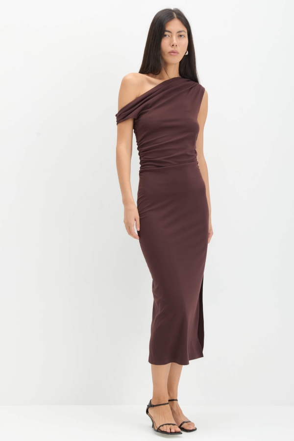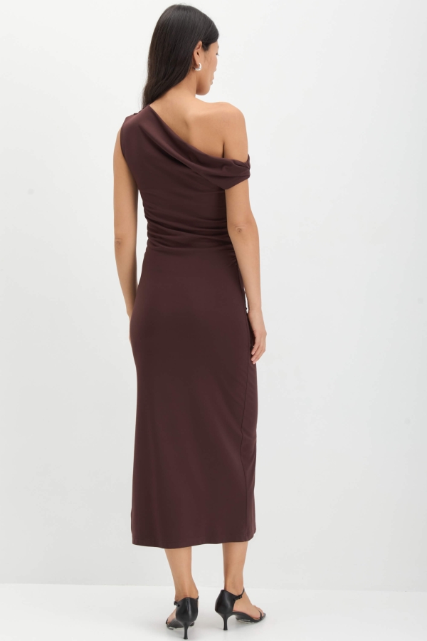 Платье с асимметричной линией плеча актуального оттенка. Модель прилегающего силуэта. По линии талии сборки. Горловина на широкой обтачке по переду и спинке. Разрез в боковом шве.