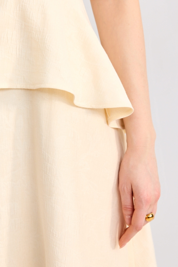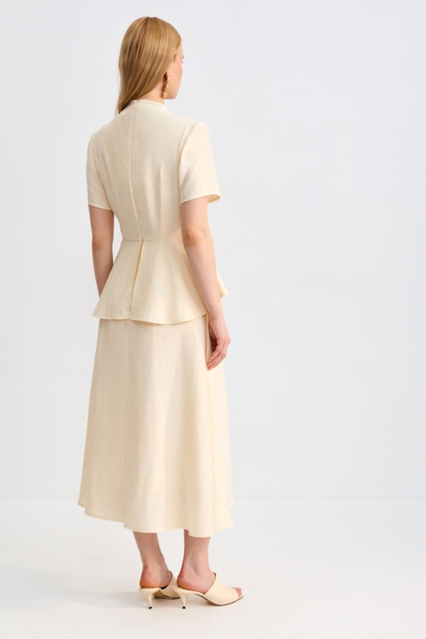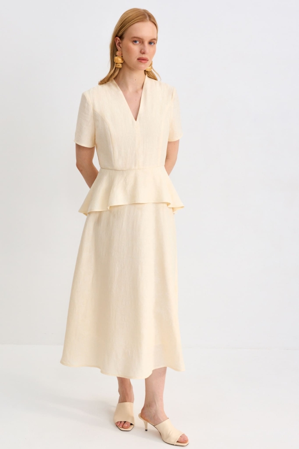 Элегантное платье с баской из вискозы-жаккард с цветочным рисунком. Модель полуприлегающего силуэта. По переду V-вырез, переходящий в небольшую цельнокроеную стойку, линия талии отрезная с баской. Застежка на потайную молнию по спинке. Изделие на хлопковом подкладе.