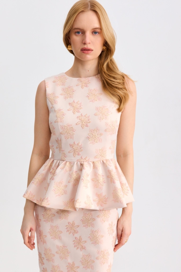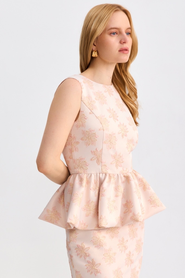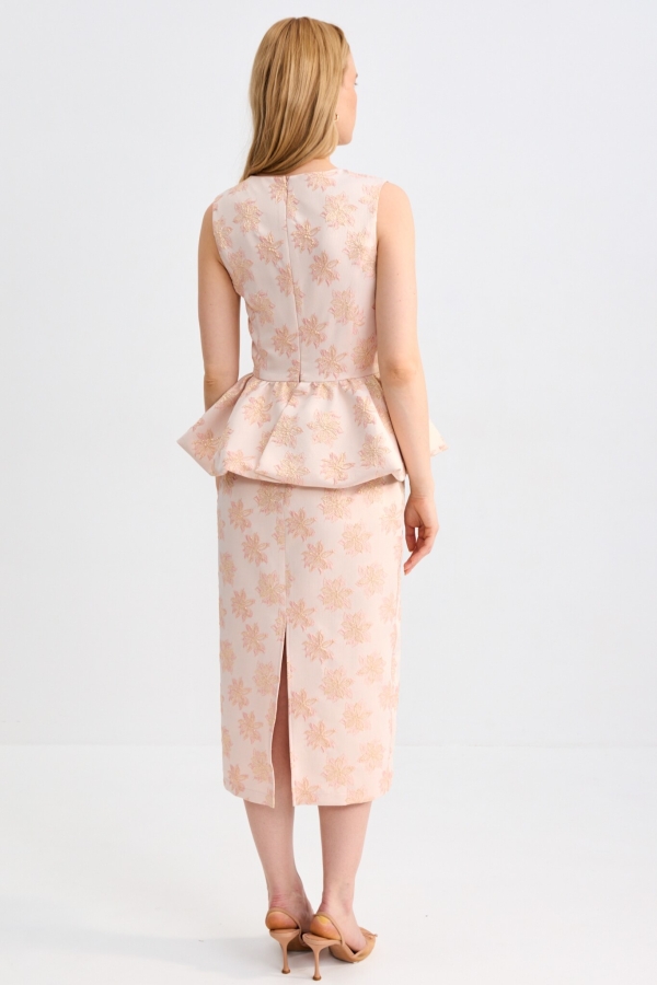 Эффектное платье с баской из жаккарда. Модель полуприлегающего силуэта, оптимальной длины ниже колена, отрезная по линии талии с пышной баской на подкладке. Изделие полностью на подкладе. По спинке разрез и застежка на потайную молнию.