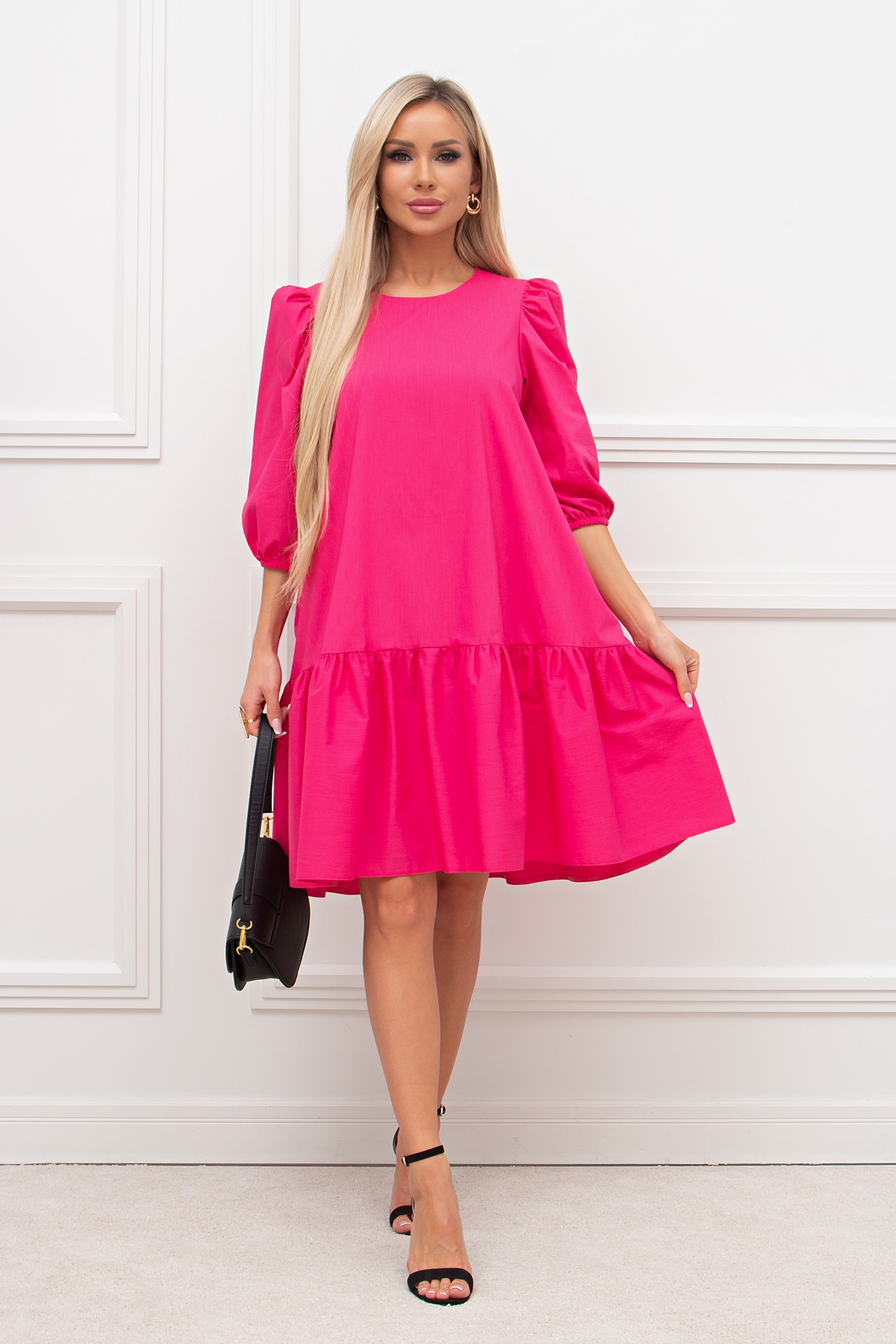 Комфортное платье А - силуэта. Округлая горловина на внутренней обтачке. В среднем шве спинки расположен разрез с застежкой на пуговицу. Втачной рукав фонарик, присборен на эластичную резинку. В боковых швах расположены функциональные карманы. Низ ровный, дополнен широким воланом.
