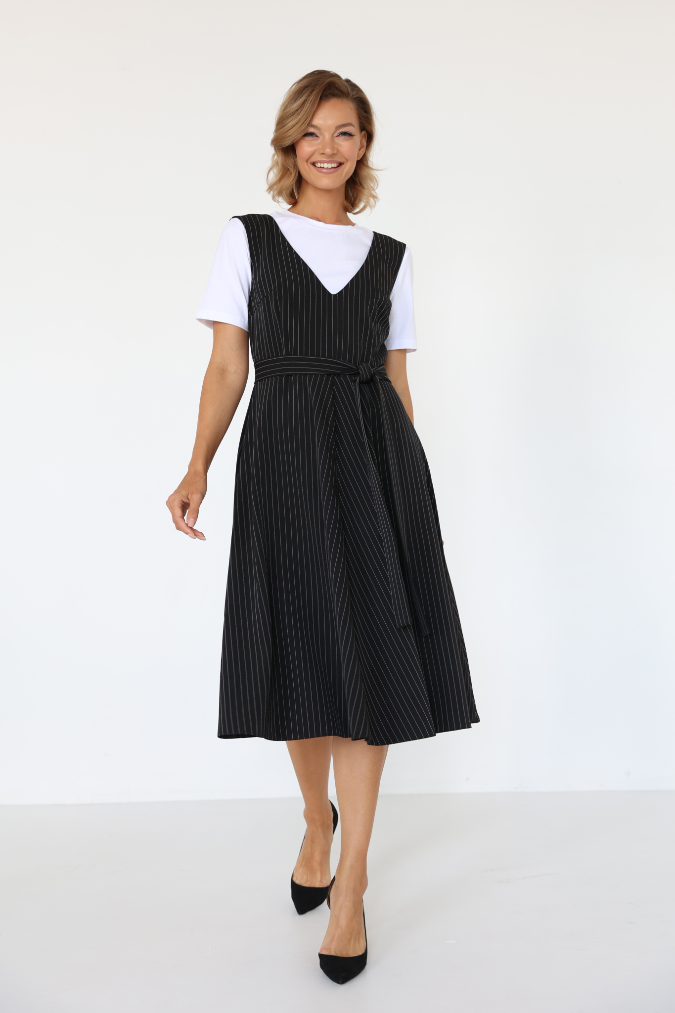 Платье-сарафан миди с юбкой полусолнце. V-образный вырез горловины. Пояс в комплекте. Ткань: костюмная пикачу.