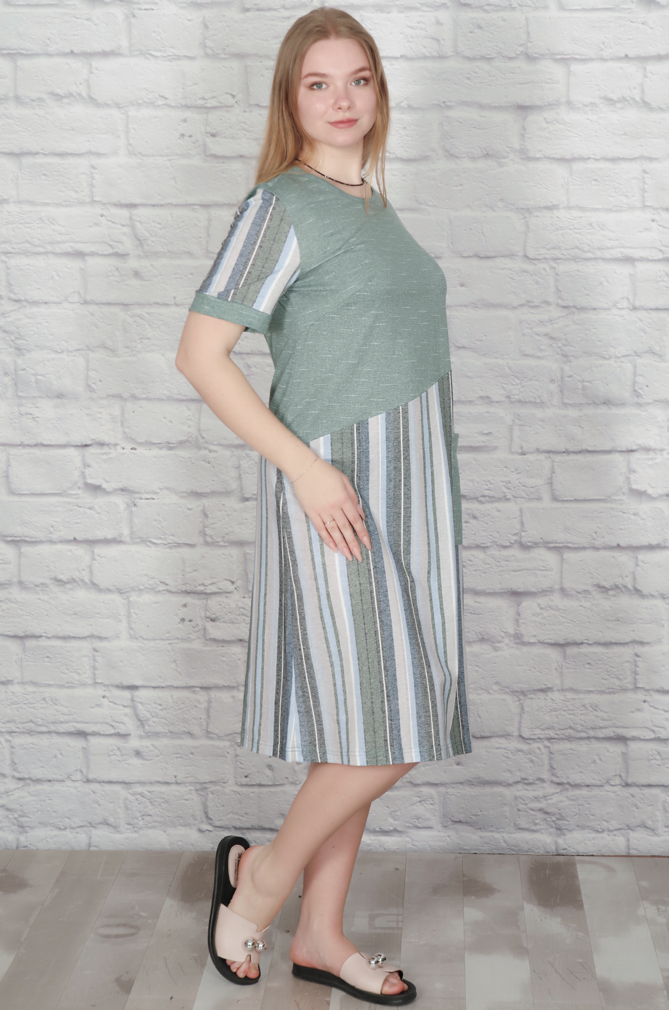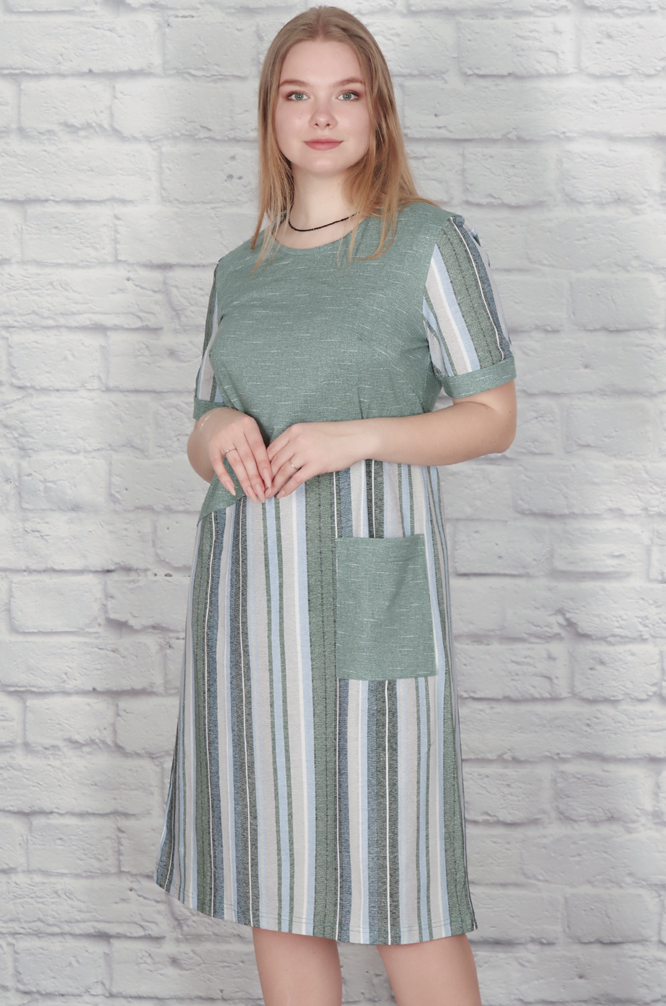 Хлопковое женское платье прямого кроя комфортной длины. Модель оригинально скомбинированна, с накладным карманом на полочке. Ткань кулирка - лёгкая, мягкая и приятная к телу.