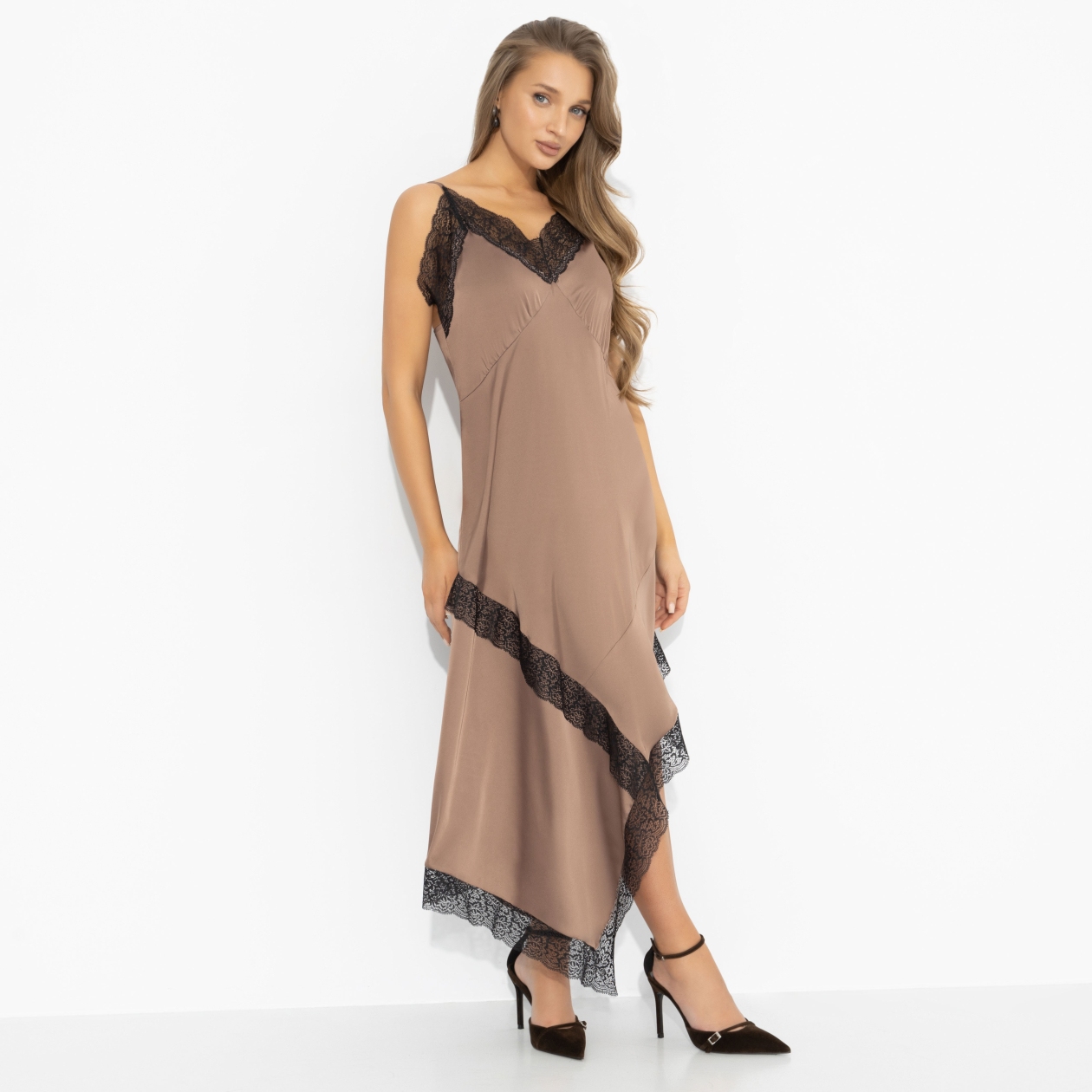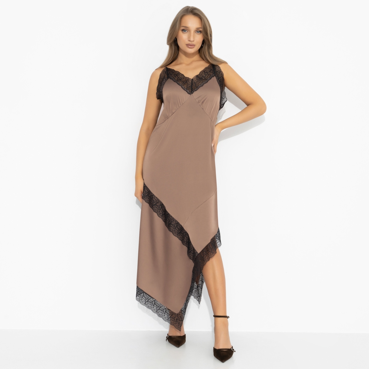 Лондонский вечер, тонкий каблук, дымка света... Так выходят не за одобрением, а за впечатлениями. Платье «Как Кейт Мосс» – про ту самую небрежную чувственность: шелк скользит по коже, кружево едва намекает, но не скрывает намерений, асимметрия делает шаг живым. Это платье не старается быть правильным – оно прямо говорит о твоем характере. Струящийся силуэт на тонких бретелях, кружевные вставки по линии декольте и низу. Шелк мягкий, эластичный, красиво драпируется и подчеркивает фигуру.