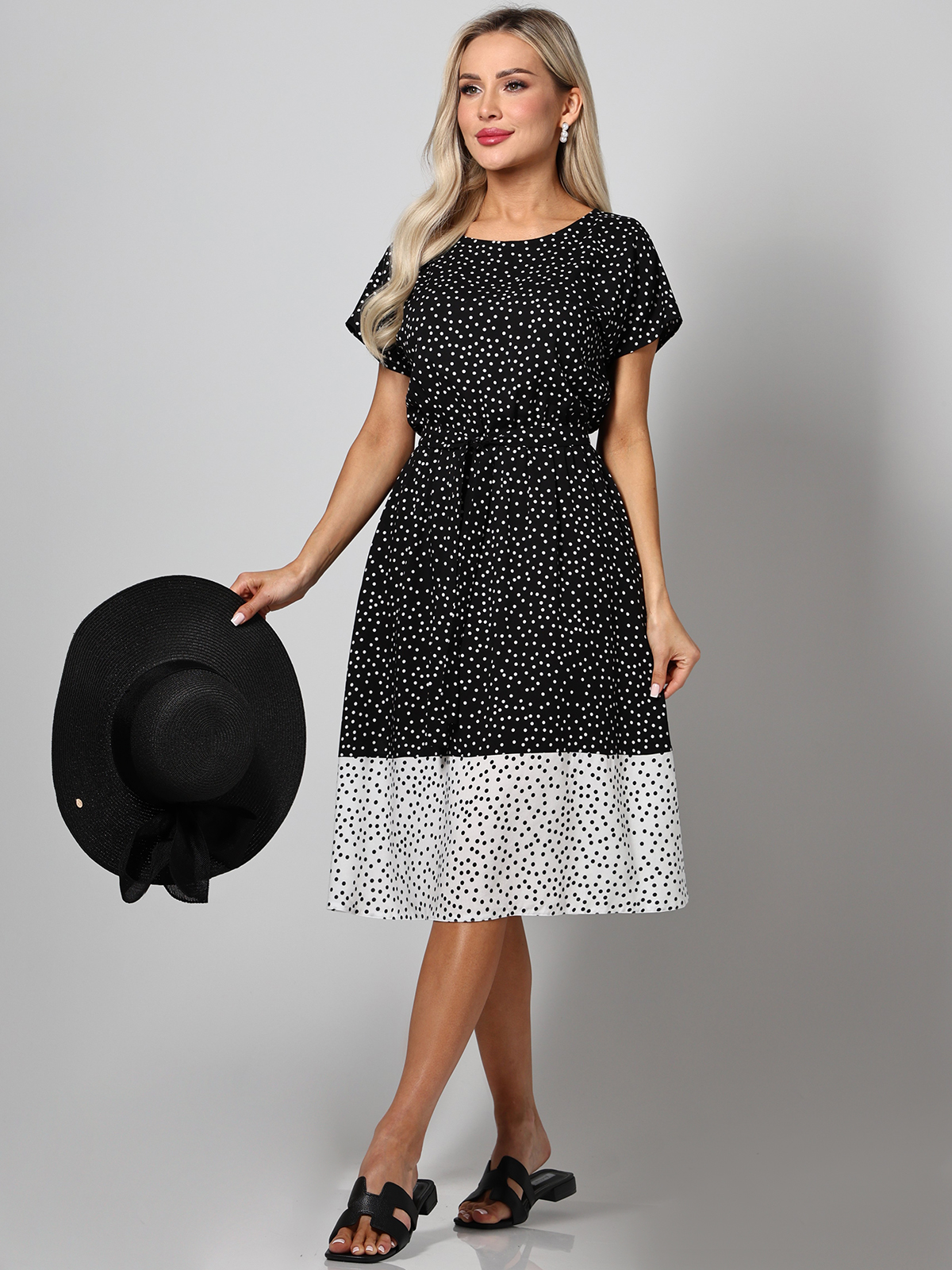Платье свободного кроя с коротким цельнокроенным рукавом - лучший выбор для гардероба! Волан по низу юбки придает образу романтический настрой, а для большей элегантности пояс платья выполнен из той же ткани, что и волан.