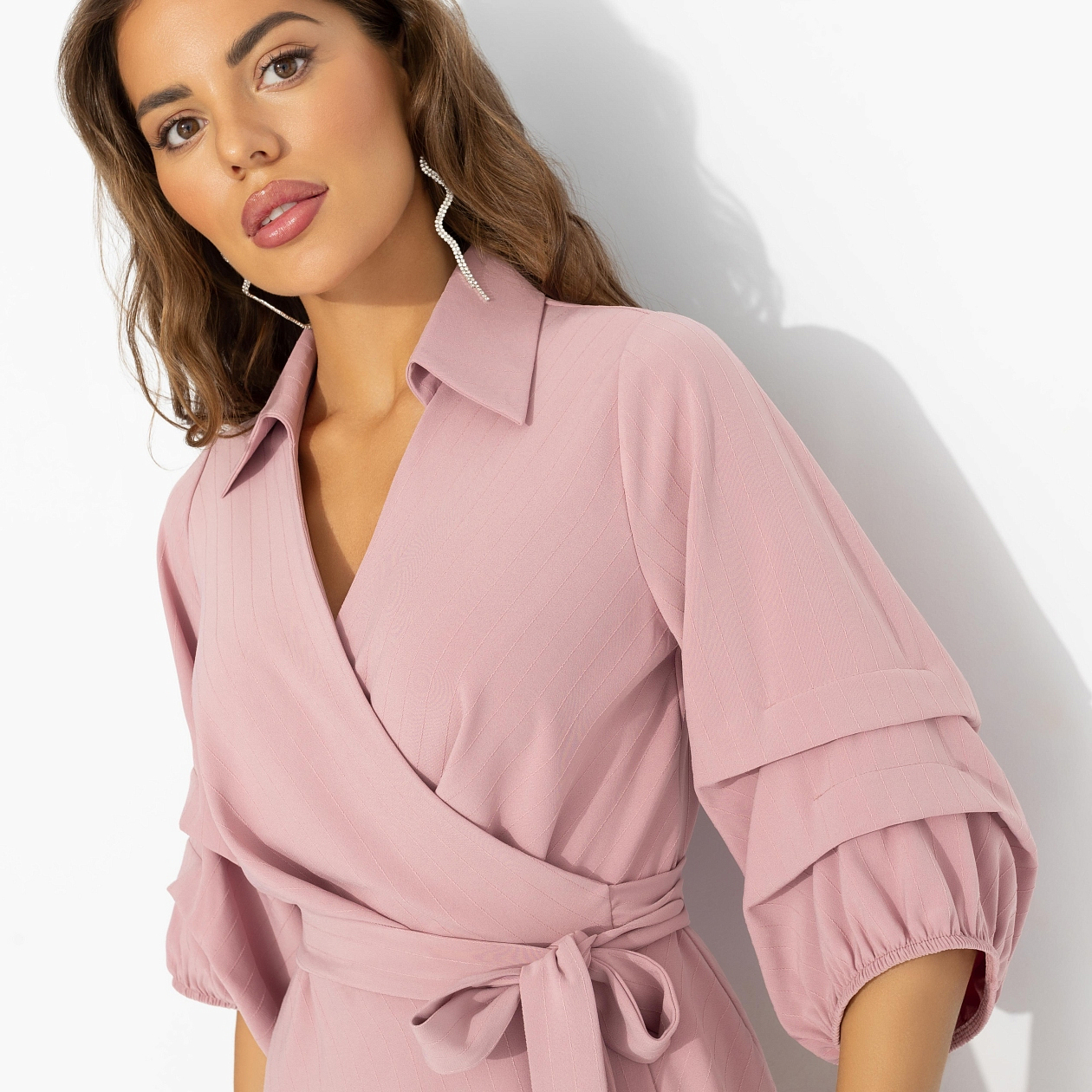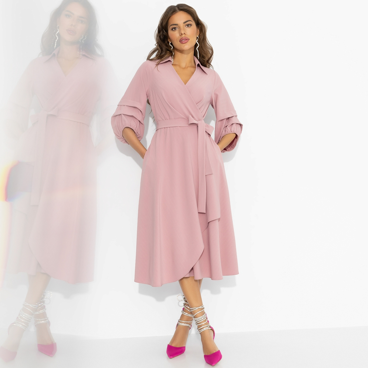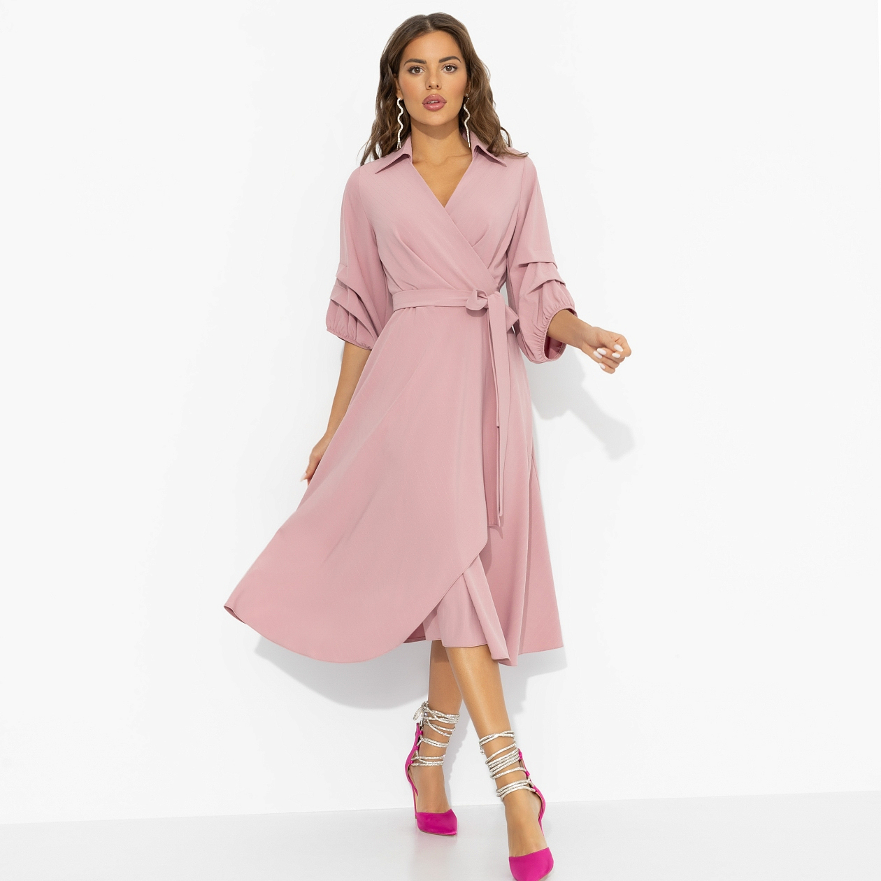 В этом платье ты – королева, французская роза, которая сама выбирает, кому подарить свою благосклонную улыбку. Легкий розовый оттенок и летящая юбка создают очень женственный, выразительный образ, и прекрасно подходит для любой фигуры. Модель с запахом, изящным воротником и многослойным асимметричным подолом подчёркивает талию и добавляет каждому движению торжественное настроение. Красота, которая ценится за форму и изысканность. Объёмные рукава с ярусами делают образ благородным и фотогеничным – то, что нужно для приёмов и светских раутов.