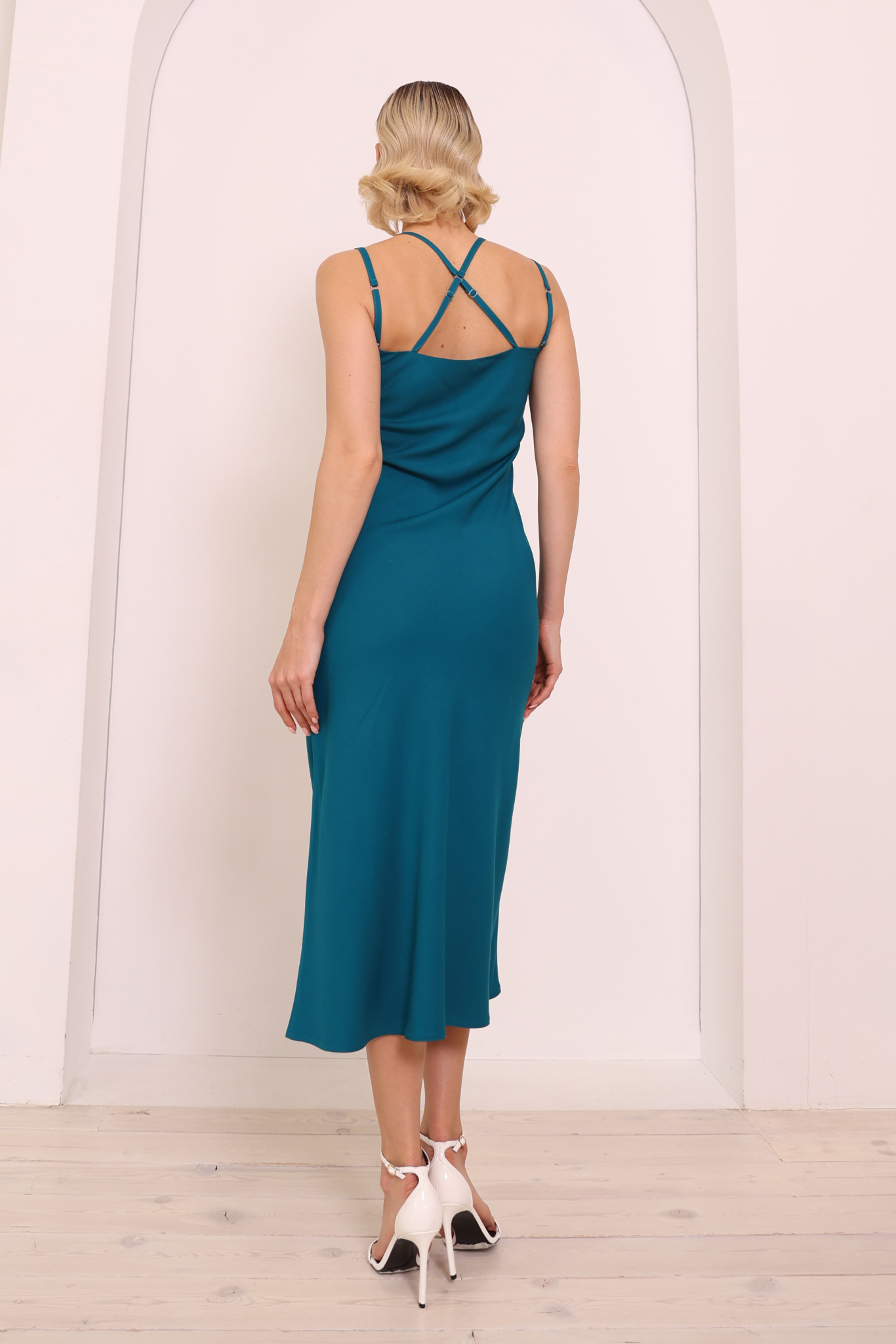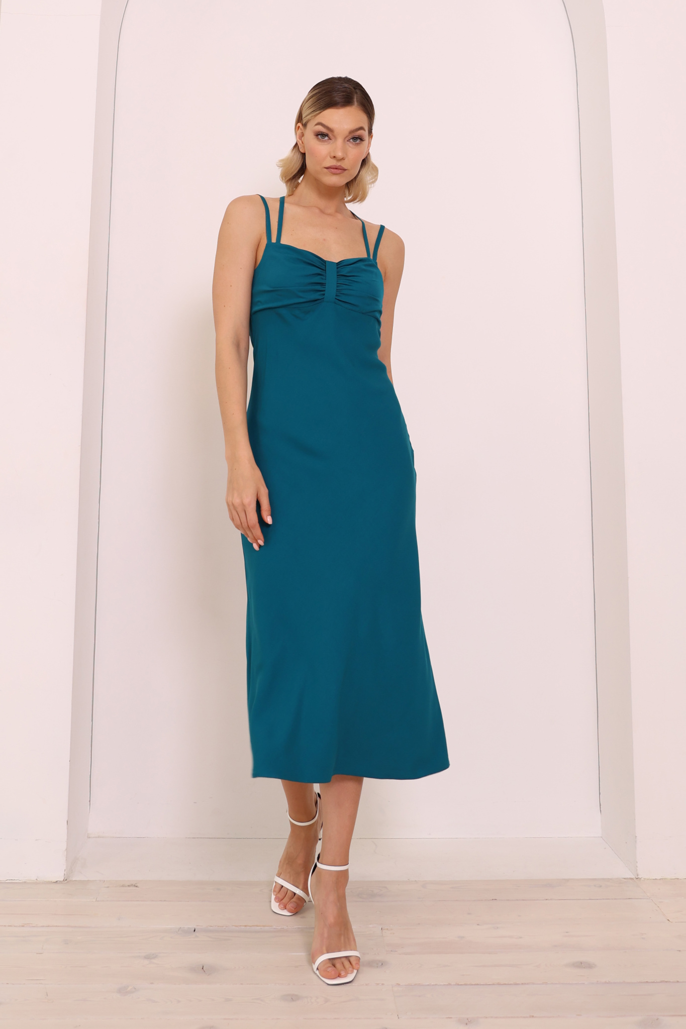 Платье на тонких двойных бретелях со сборкой по лифу. Бретели регулируются по длине. Разрезы в боковых швах. Ткань: плательная вискоза