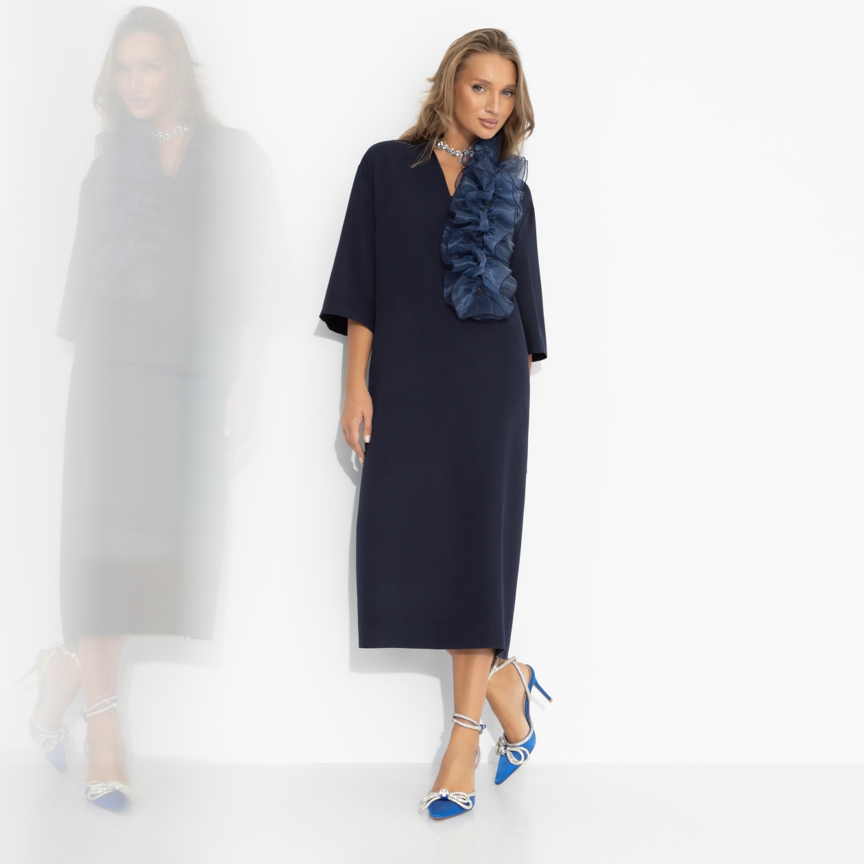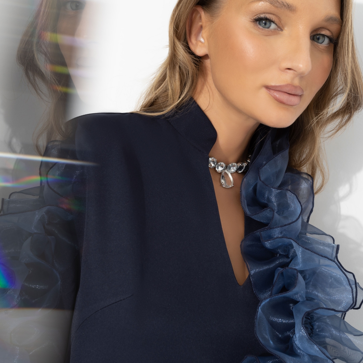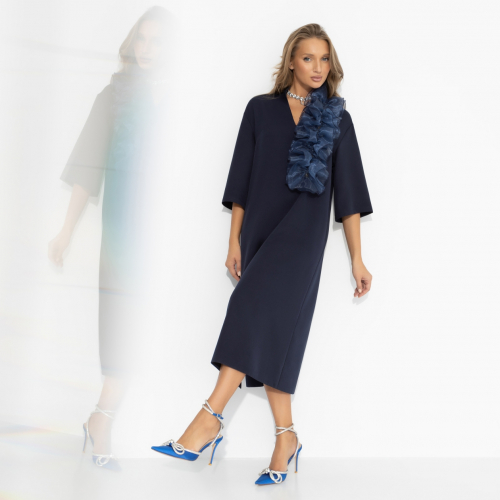 За окном – мягкий снег и мерцающие огни. Внутри – тепло, музыка и лёгкий блеск твоего нового платья. Оно словно создано для зимнего вечера, когда уют встречается с роскошью, а настроение становится праздничным. Платье длины миди с V-образным вырезом. Мягкий силуэт и декоративный акцент из органзы придают образу выразительность. Декор съемный.