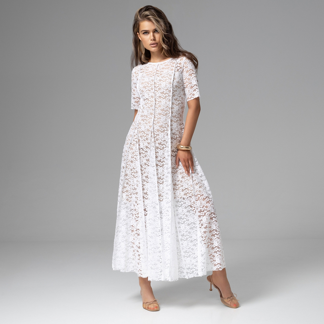 Приятно быть женщиной, которая знают себе цену. Вам не нужно привлекать внимание – оно приходит само. Кружевное платье из премиальной линейки ЧАРУТТИ создано именно для такого настроения: благородная фактура, спокойная уверенность и та самая тихая роскошь. Кружевная фактура создаёт изящную игру света и тени, а мягкий трикотажный подклад обеспечивает комфортную посадку. Приталенный крой и длина миди формируют вытянутый, элегантный силуэт. Этот образ говорит о вас больше любых слов.