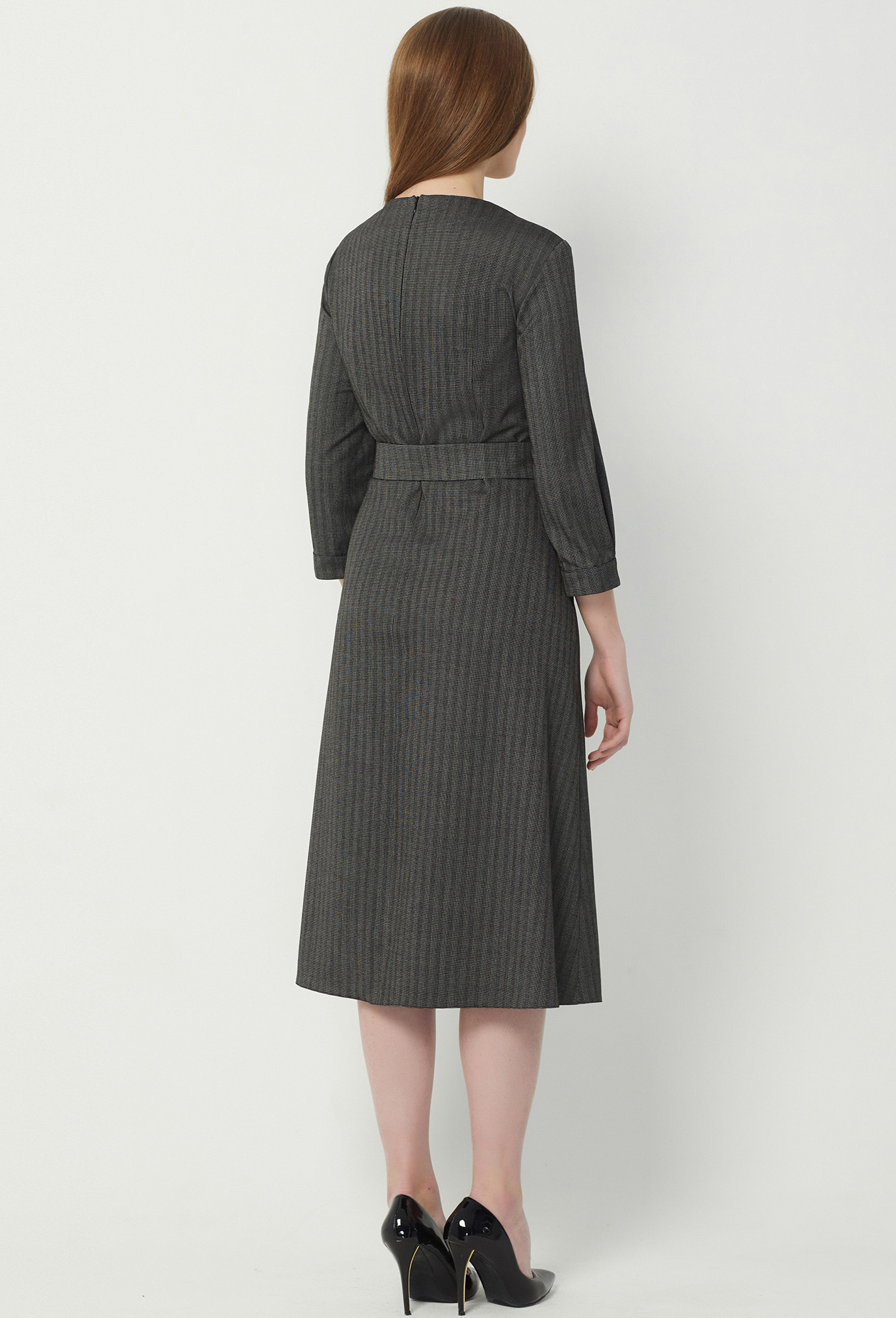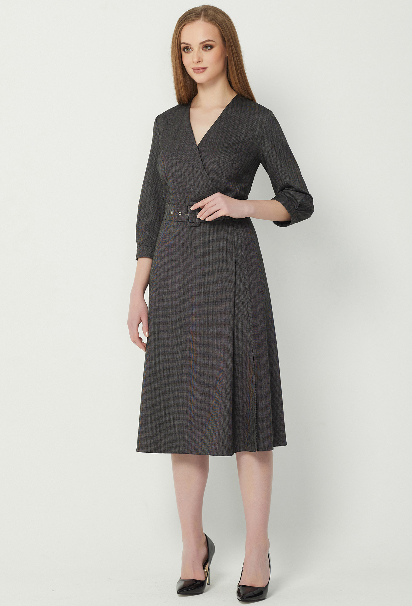 Модель: Солеи 3816 т.серый Рост: ..показать170 см (девушка на фото ростом 170см) Сезон: Круглогодичный Тип ткани: 65% полиэстер, 32% вискоза, 3% эластанПлатье-миди интересного кроя полуприлегающего силуэта, отрезное по линии талии и лифом на запах. Перед с V-образным вырезом горловины и косыми нагрудными вытачками в верхней части, вертикальным швом с разрезом и складкой по нижней части. В среднем шве спинки обработана потайная молния. Рукава втачные одношовные со встречными складками по низу и притачными манжетами.