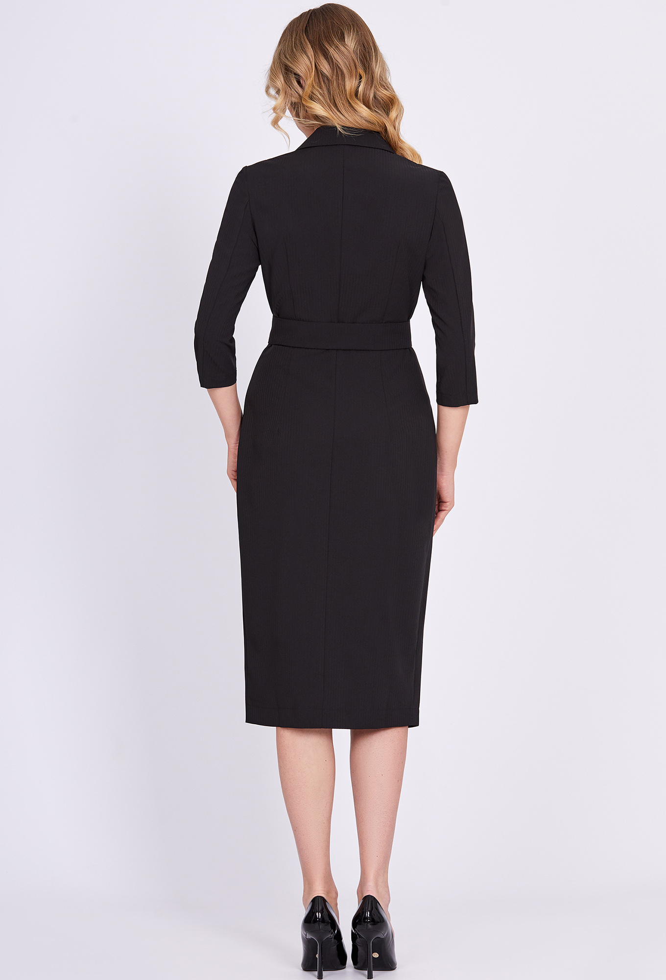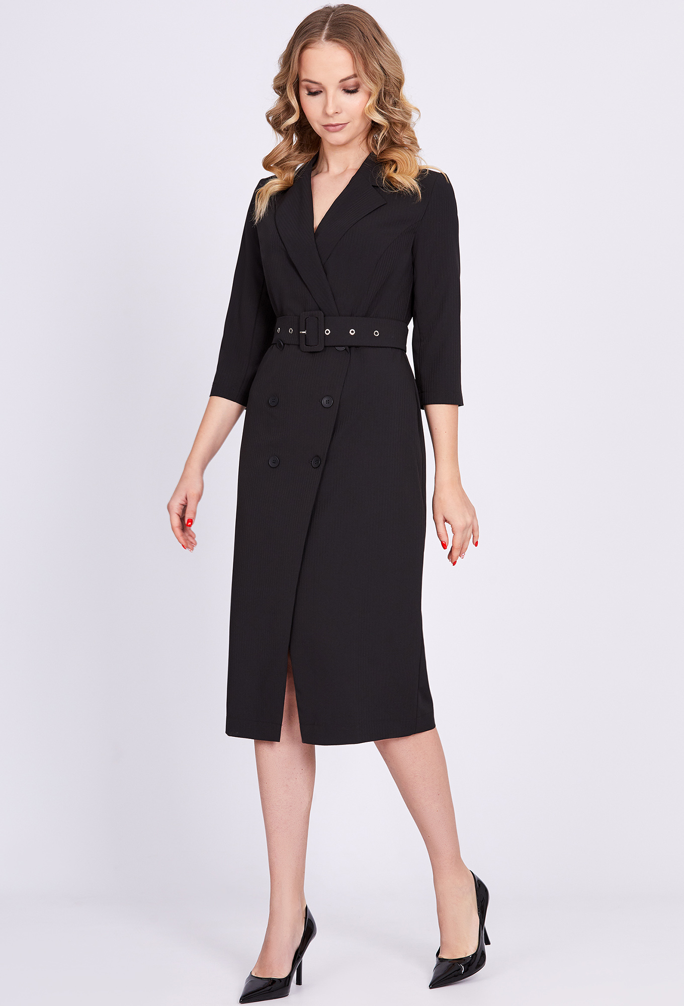 Модель: Солеи 3858 черный Рост: 1..показать70 см (девушка на фото ростом 170см) Сезон: Круглогодичный Тип ткани: 65% полиэстер, 32% вискоза, 3% эластанЭлегантное платье-миди приталенного силуэта с двубортной застёжкой на петли-пуговицы, с отложным воротником с лацканами. Рукава втачные двухшовные, дополняется поясом с пряжкой из основной ткани.