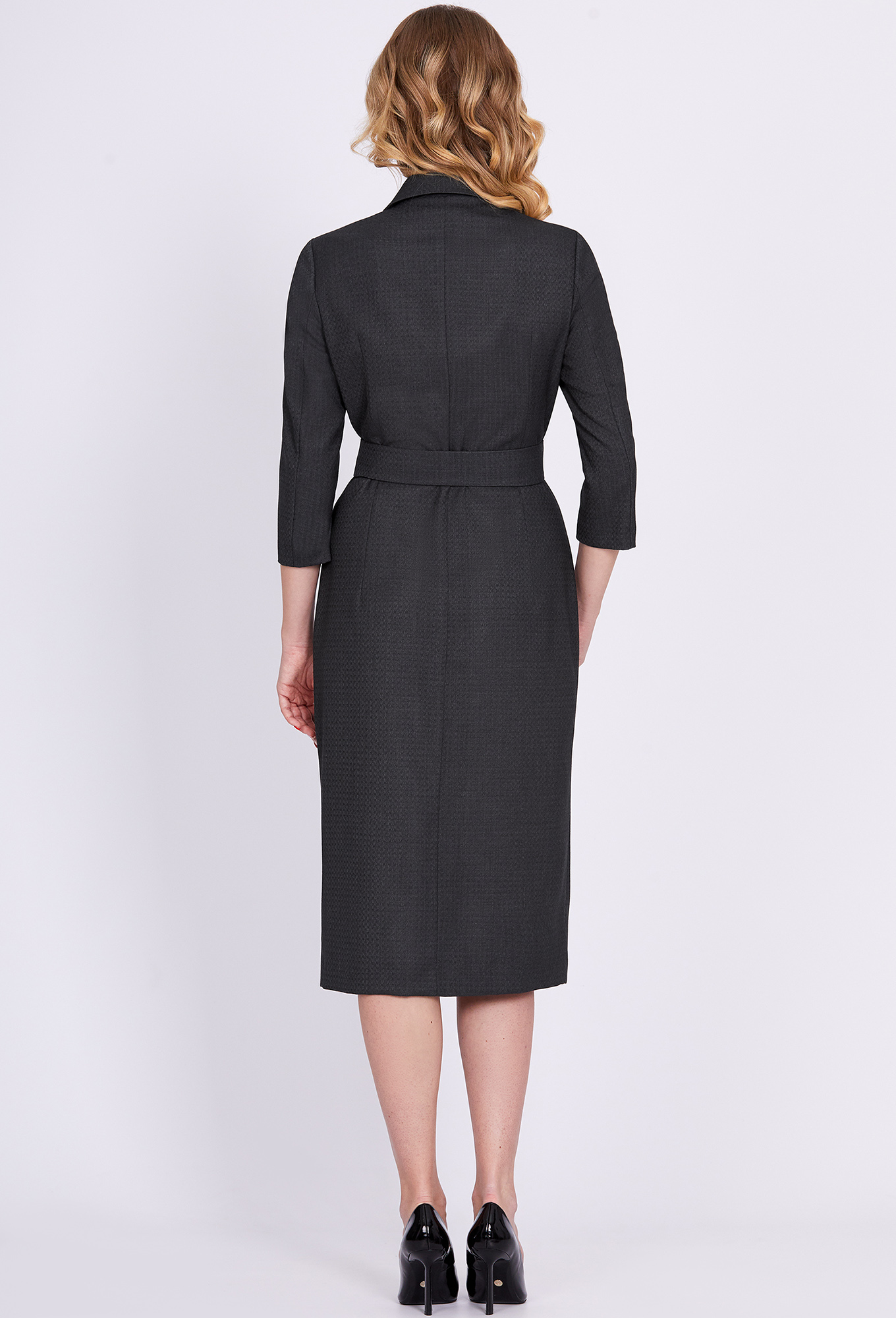 Модель: Солеи 3858 серый ромб Рос..показатьт: 170 см (девушка на фото ростом 170см) Сезон: Круглогодичный Тип ткани: 65% полиэстер, 32% вискоза, 3% эластанЭлегантное платье-миди приталенного силуэта с двубортной застёжкой на петли-пуговицы, с отложным воротником с лацканами. Рукава втачные двухшовные, дополняется поясом с пряжкой из основной ткани.