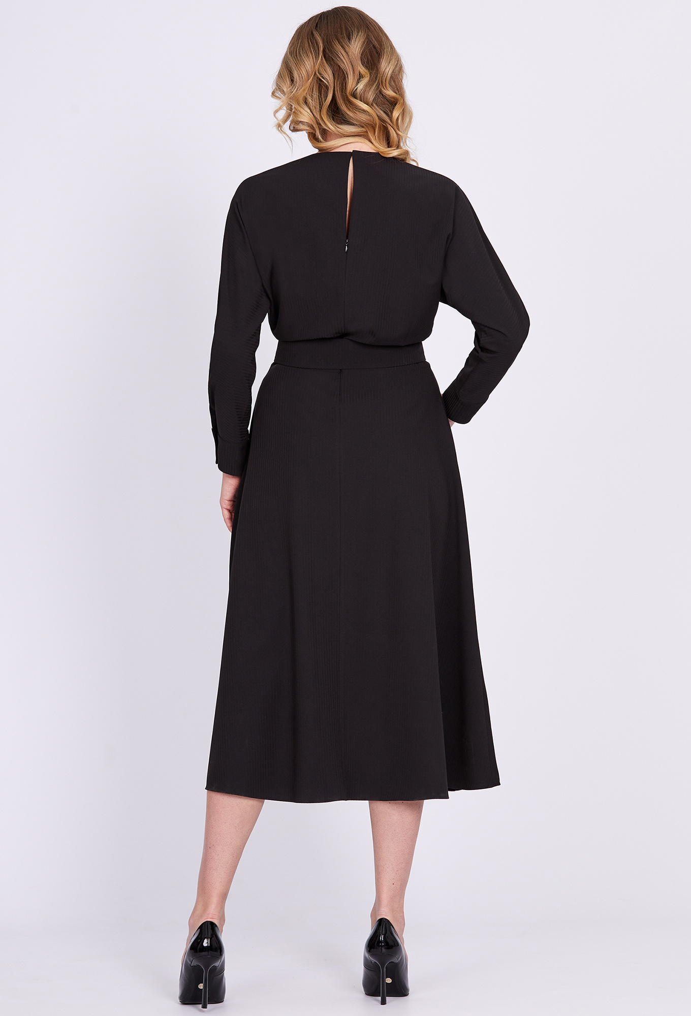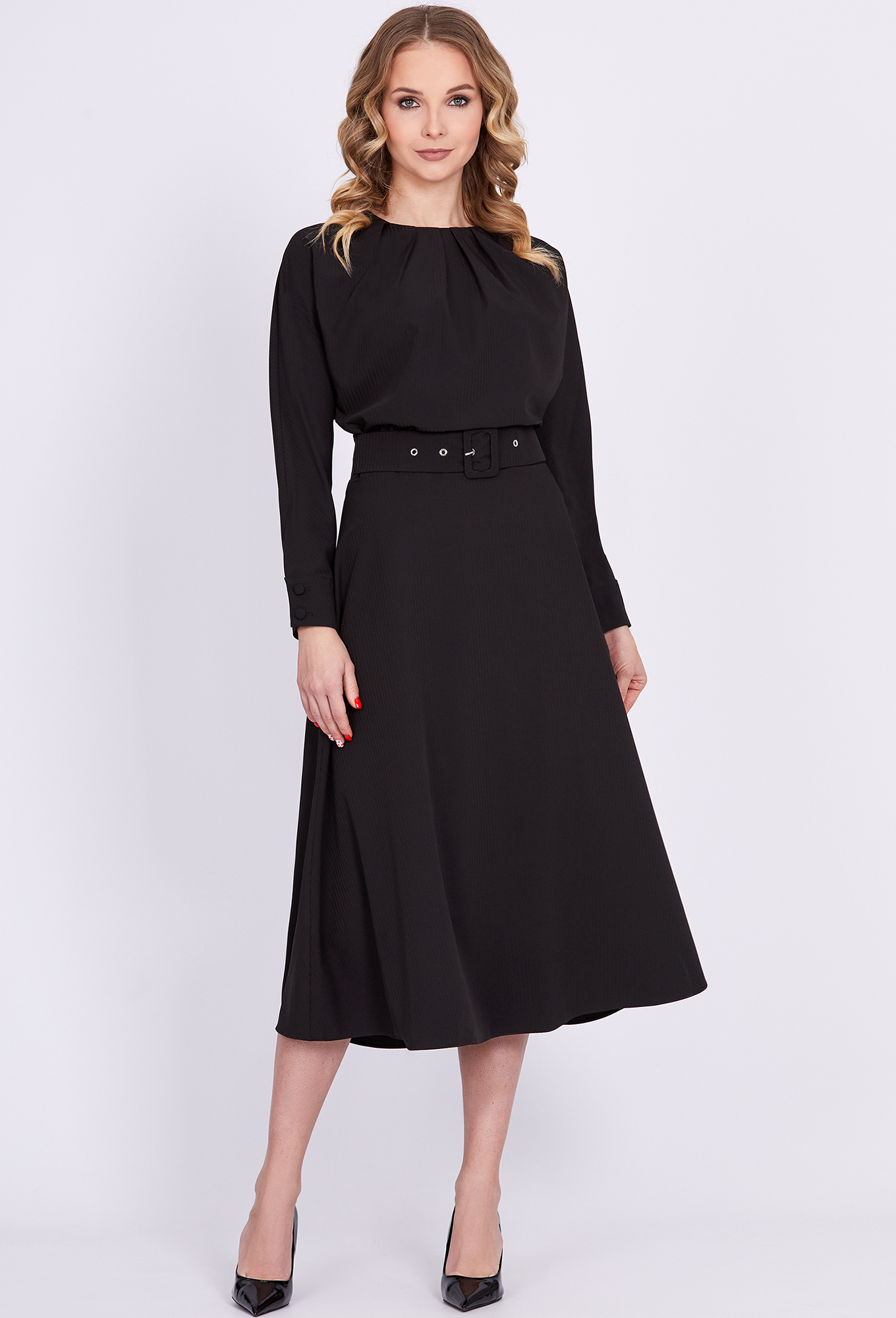 Модель: Солеи 4014 черный Рост: 1..показать70 см (девушка на фото ростом 170см) Сезон: Круглогодичный Тип ткани: 65% полиэстер, 32% вискоза, 3% эластанЭлегантное платье-миди – превосходный вариант для особого случая. Платье с округлым вырезом горловины со складками по подрезу, отрезное по линии талии, со свободным кроем топа и юбкой А-силуэта, цельновыкроенными рукавами с притачными манжетами с застёжкой на петли и пуговицы. В среднем шве спинки обработаны потайная молния и застёжка на навесную петлю и пуговицу. Дополняется поясом с пряжкой из основной ткани. Ремень может отличаться от студийного фото.