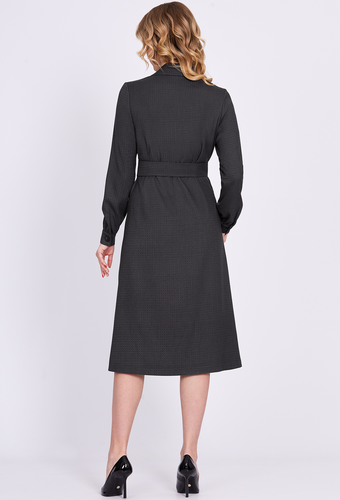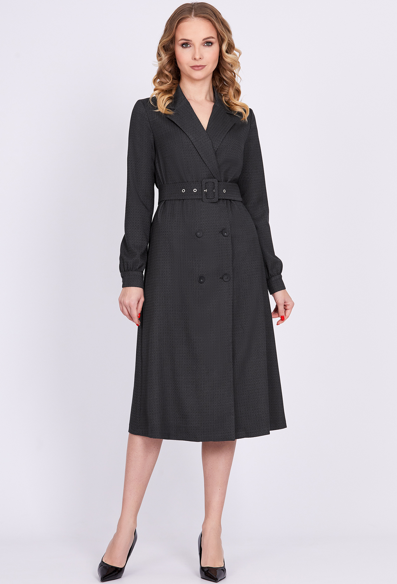 Модель: Солеи 4028 серый Рост: 17..показать0 см (девушка на фото ростом 170см) Сезон: Круглогодичный Тип ткани: 65% полиэстер, 32% вискоза, 3% эластанПлатье А-образного силуэта, перед с двубортной застежкой на петли и пуговицы, и потайные кнопки, и двумя нагрудными вытачками. Рукава втачные одношовные, сосборенные по низу, с притачными манжетами с застежкой на петли и пуговицы. Воротник отложной с лацканами. Дополняется поясом с пряжкой из основной ткани.