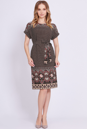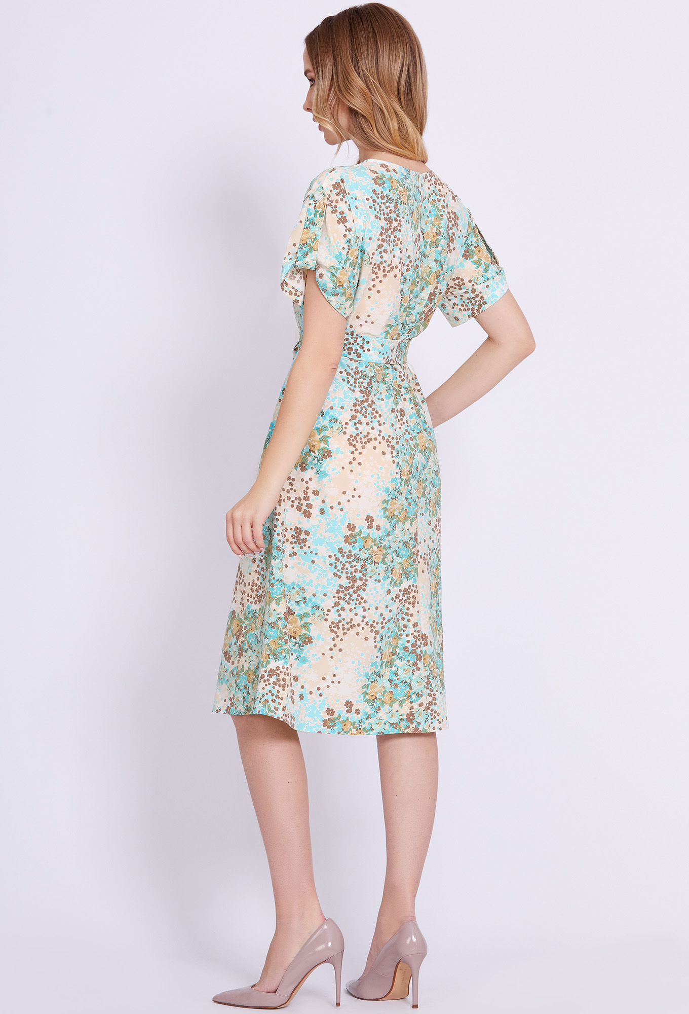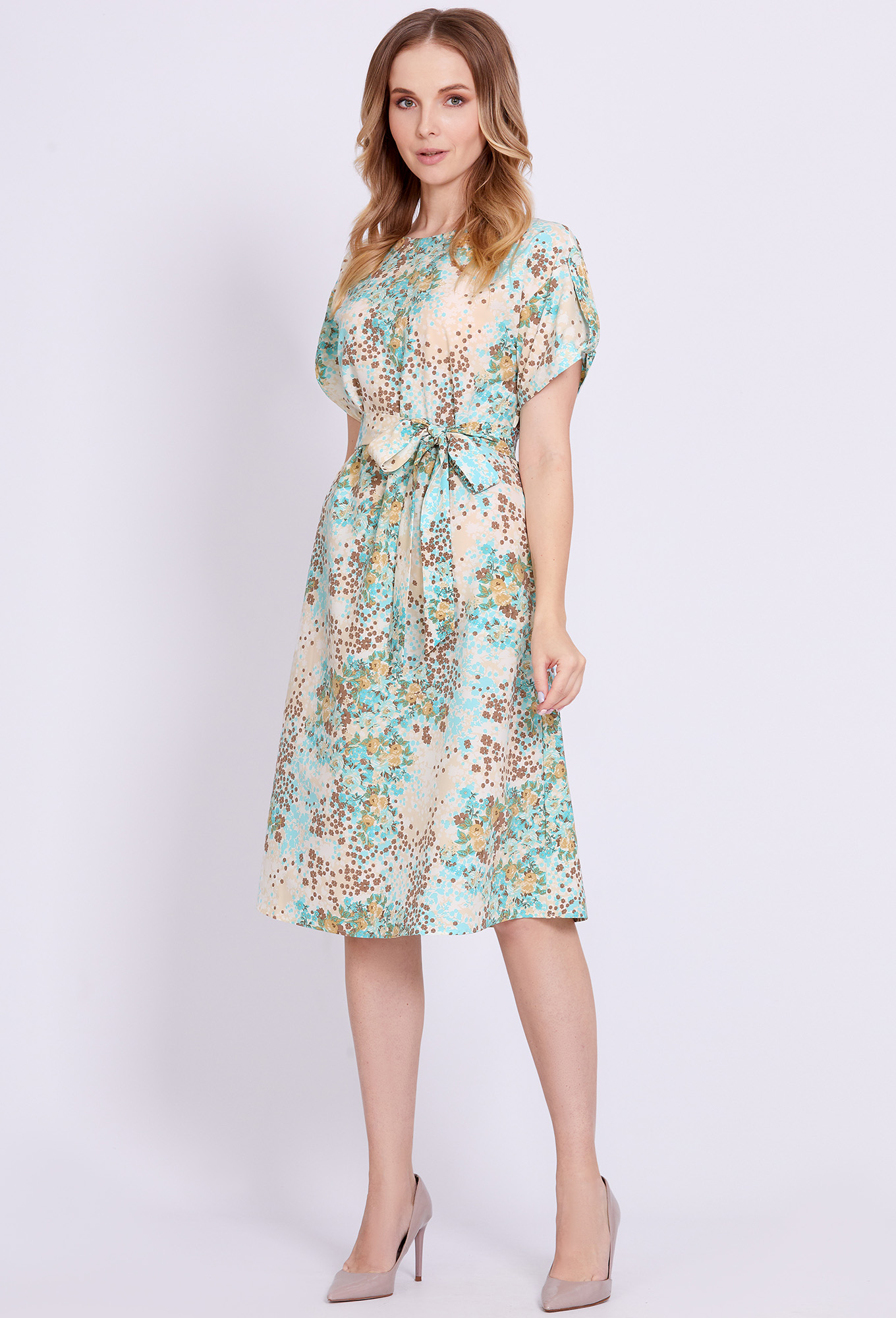 Модель: Солеи 4588 голубой цветы ..показатьРост: 170 см (девушка на фото ростом 170см) Сезон: Весна-Лето Тип ткани: 100% вискозаМинималистичное платье А-образного силуэта с округлой формой горловины, со спущенной линией проймы и длины ниже колен, выполнено из мягкой, приятной к телу ткани и интересным женственным принтом. Особое внимание в этой модели привлекают рукава с отделочными патами и пуговицами. В боковых швах обработаны функциональные карманы, а в среднем шве спинки – застёжка на навесную петлю и пуговицу. Модель дополнена поясом-подчёркивающим талию.