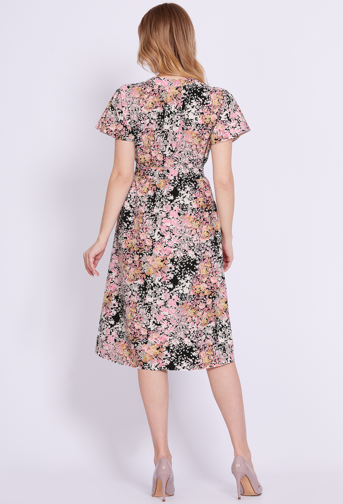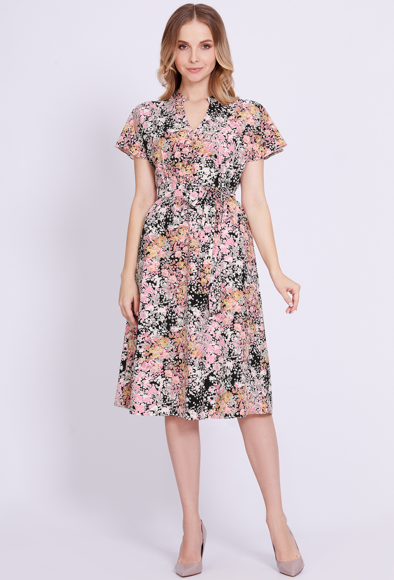Модель: Солеи 4589 розовый цветы ..показатьРост: 170 см (девушка на фото ростом 170см) Сезон: Весна-Лето Тип ткани: 100% вискозаНежное, легкое, комфортное платье А-образного силуэта, выполнено из мягкой, приятной итальянской вискозной ткани с акварельным цветочным принтом. Модель, с цельнокроеными рукавами, V-образным вырезом горловины, фигурным воротником-стойкой и функциональными карманами в боковых швах, дополнили интересным элементом по горловине спинки в виде сборки на венгерку в несколько рядов. Чтобы сделать платье еще более эффектным – линию талии подчеркнули стильным поясом-ремнем с пряжкой.