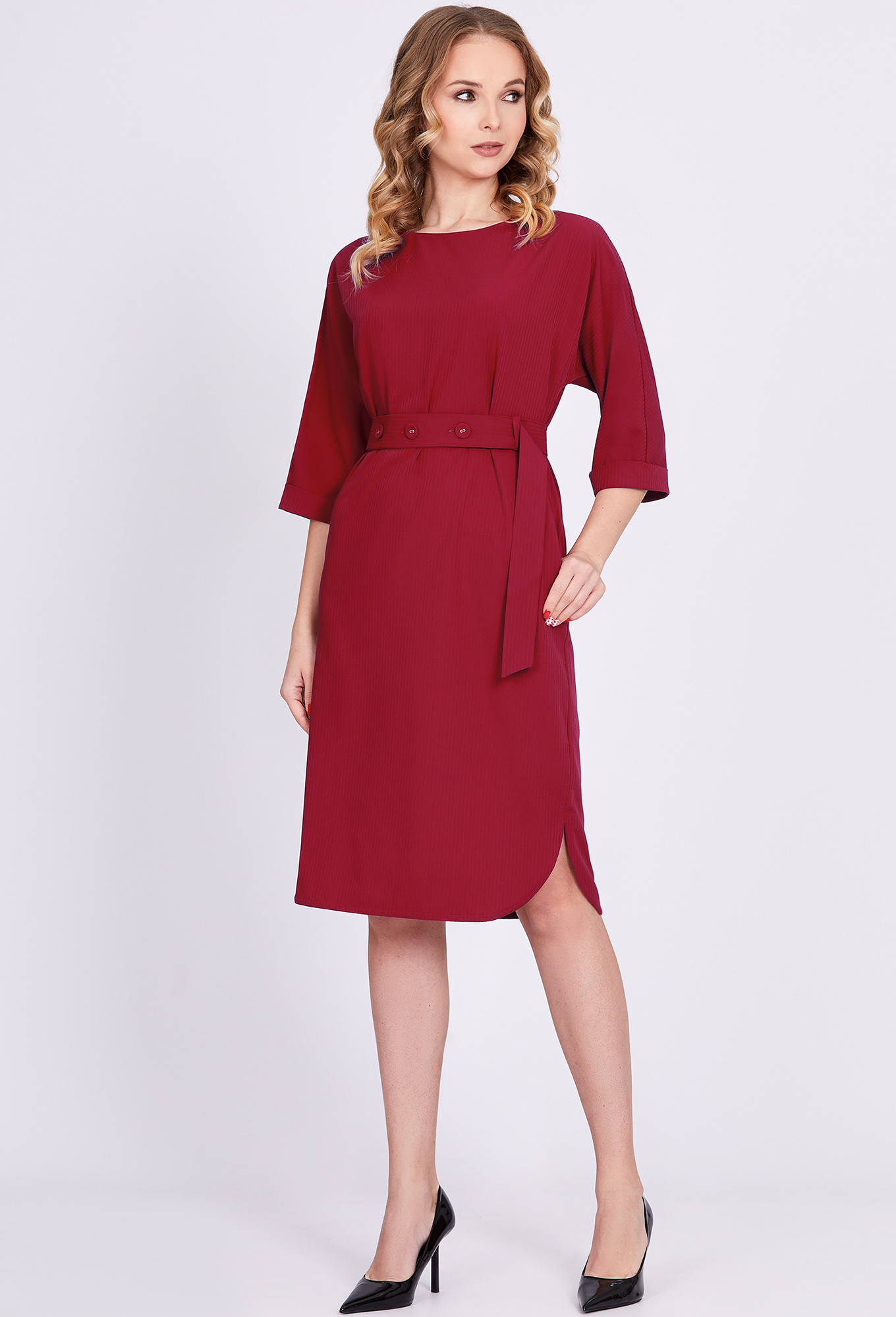 Модель: Солеи 4600 красный Рост: ..показать170 см (девушка на фото ростом 170см) Сезон: Круглогодичный Тип ткани: 65% полиэстер, 32% вискоза, 3% эластанНесмотря на лаконичный крой платья, в нём вы обязательно окажетесь в центре внимания, благодаря красивой ткани. Модель свободного кроя с цельнокроенными рукавами, с приталенными отложными манжетами и фигурной формой низа. В среднем шве спинки обработана застёжка на навесную петлю и пуговицу, в боковых швах обработаны функциональные карманы. Линия талии красиво подчёркивается интересным поясом с пуговицами из основной ткани.