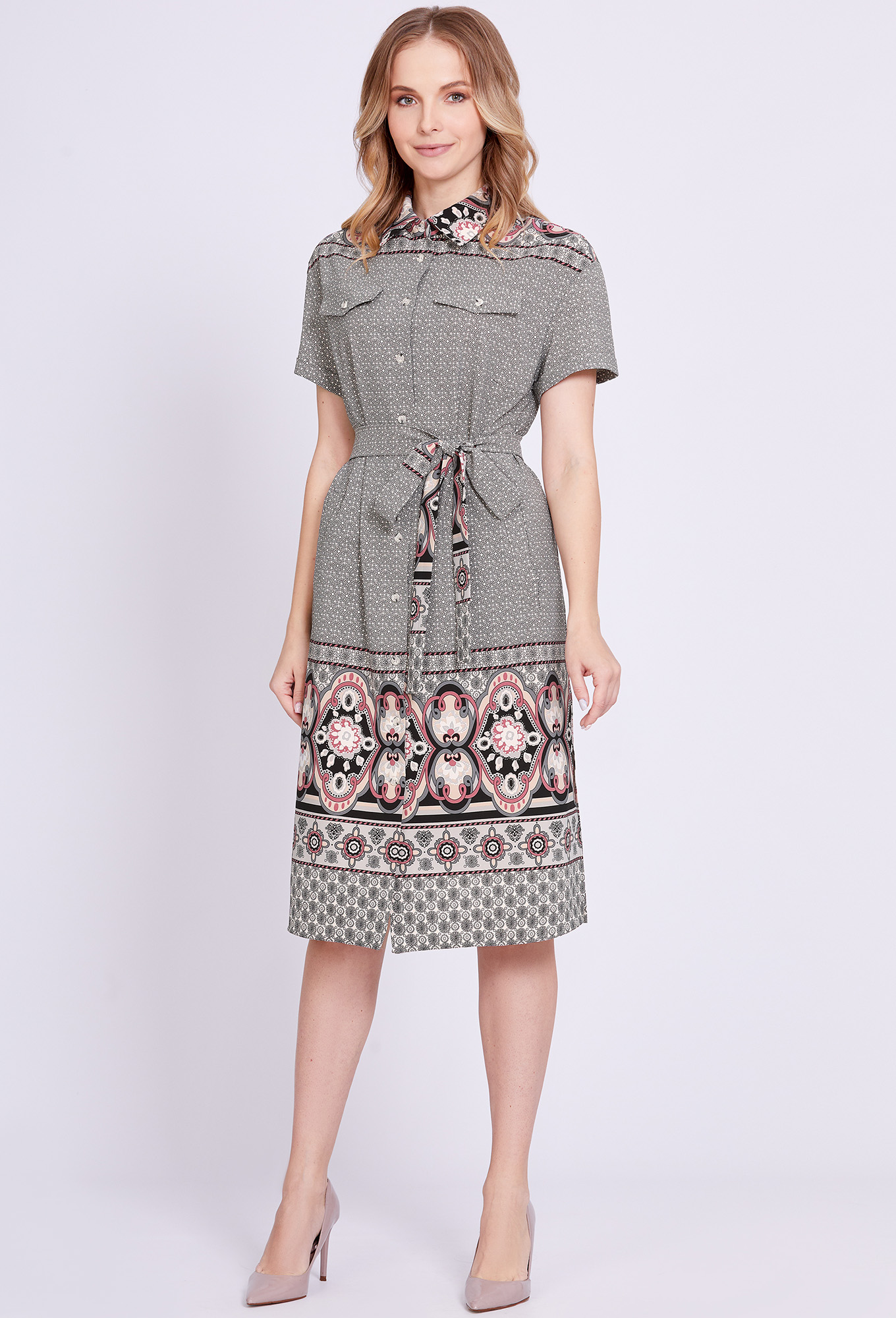 Модель: Солеи 4659 черный цветы Р..показатьост: 170 см (девушка на фото ростом 170см) Сезон: Весна-Лето Тип ткани: 100% вискозаПлатье-рубашка с оригинальным принтом. Модель прямого силуэта с отложным воротником с отрезной стойкой, с центральной застежкой на петли и пуговицы, со спущенной линией плеча и притачными короткими рукавами с отложными манжетами. Изделие дополнено отделочными нагрудными клапанами, функциональными карманами с листочками и поясом с пряжкой в цвет платья. Боковые швы заканчиваются разрезами. Платье будет отличным вариантом для работы или прогулки.
